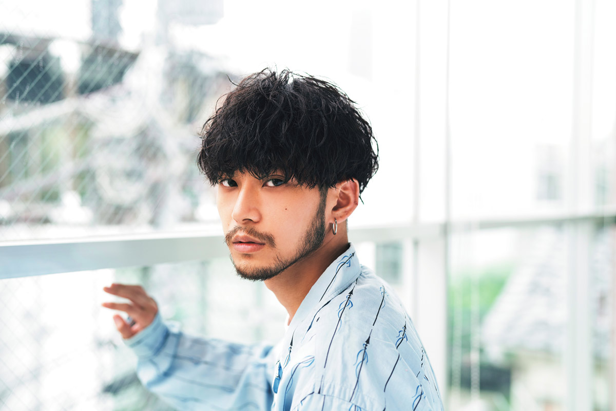 重めの刈り上げマッシュヘアにツイストスパイラルパーマを施したトレンド感あるスタイル。グリースのウエットな質感で、パーマによる無造作な動をぐっと引き立てた。担当/保利祥汰さん、モデル/宮城和浩くん