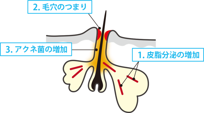 ストレスや食生活の乱れ、誤ったスキンケアなどが毛穴の詰まりや過剰な皮脂分泌を招き、皮脂を栄養源とするアクネ菌(ニキビのもと)を増殖させることで、ニキビが発生。正しい洗顔&保湿で予防を!
