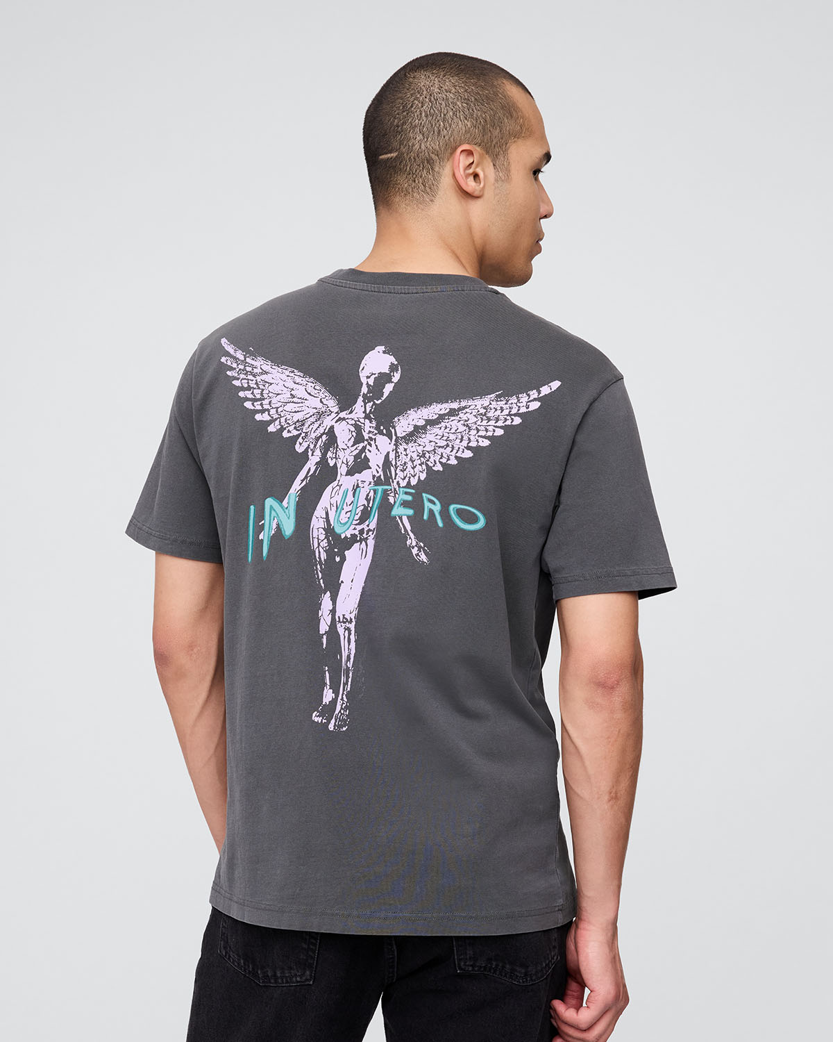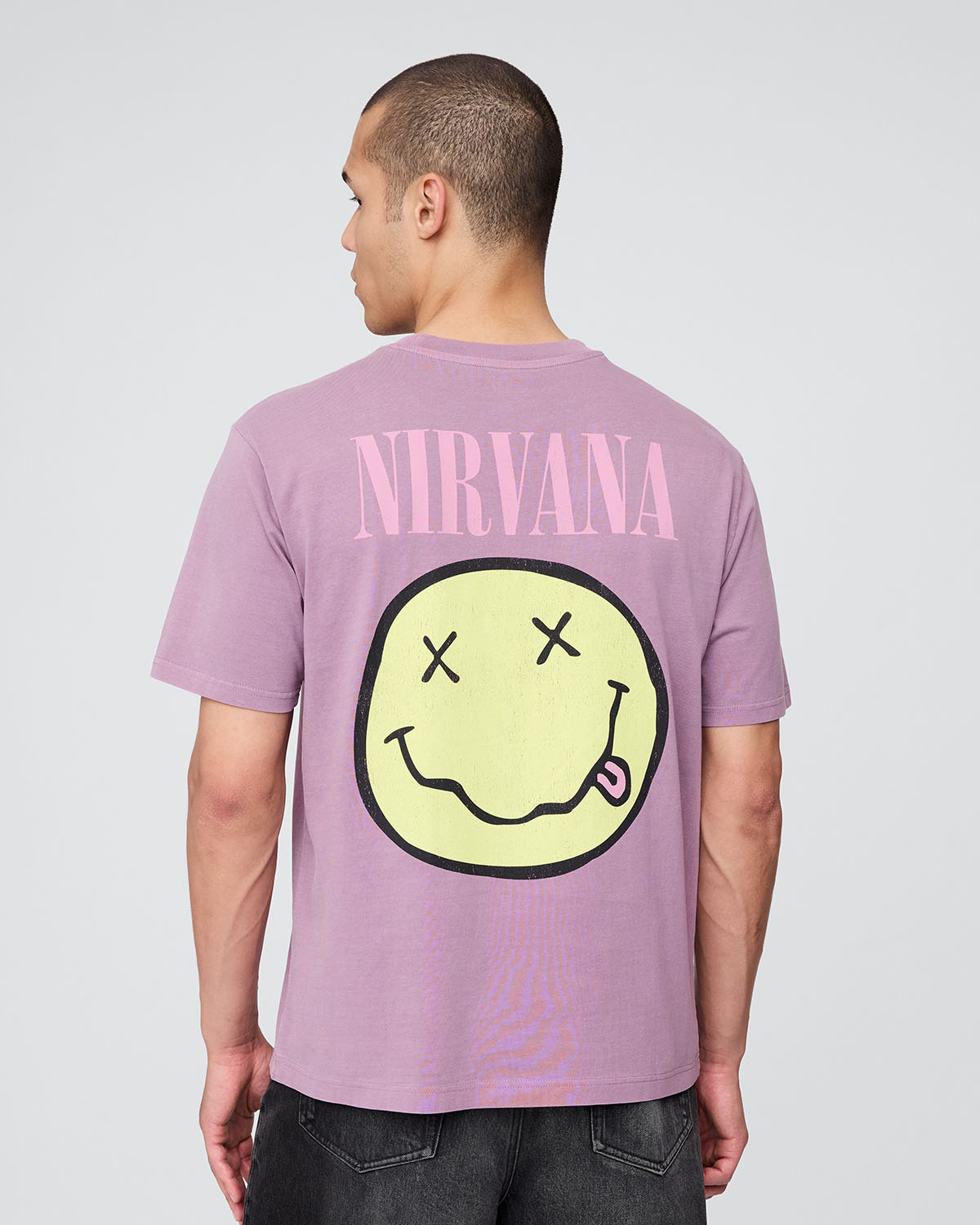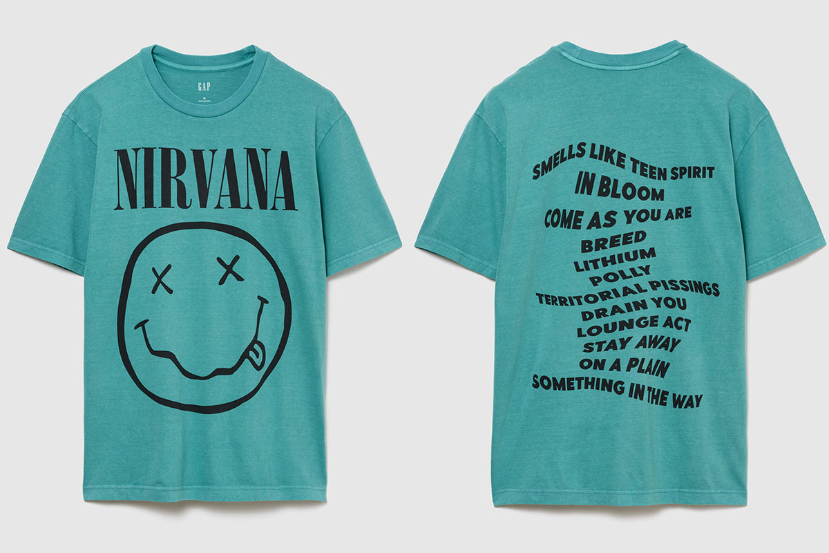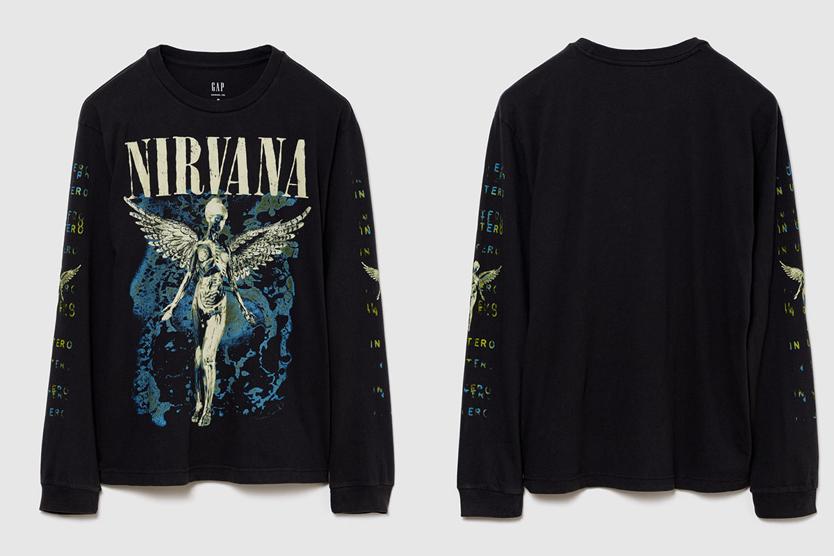 半袖TシャツとロングスリーブTシャツの2型がラインナップ。半袖Tシャツは、フロントにバンドを象徴するスマイリーフェイス、バックはアルバム「Nevermind」の収録曲をプリント。ロングスリーブTシャツは、アルバム「In Utero」からインスパイアされたデザイン。7990円