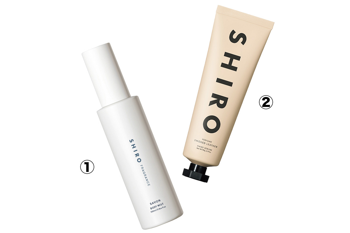 ②リッチな潤いと香りを楽しめるハンド美容液。ハンドクリームと比べて、サラッとしたみずみずしいテクスチャーになっているのが特徴。香りはスモークレザーで、複雑な渋みのある大人の香りを楽しませてくれる。4950円(ともにシロ ルミネエスト新宿)