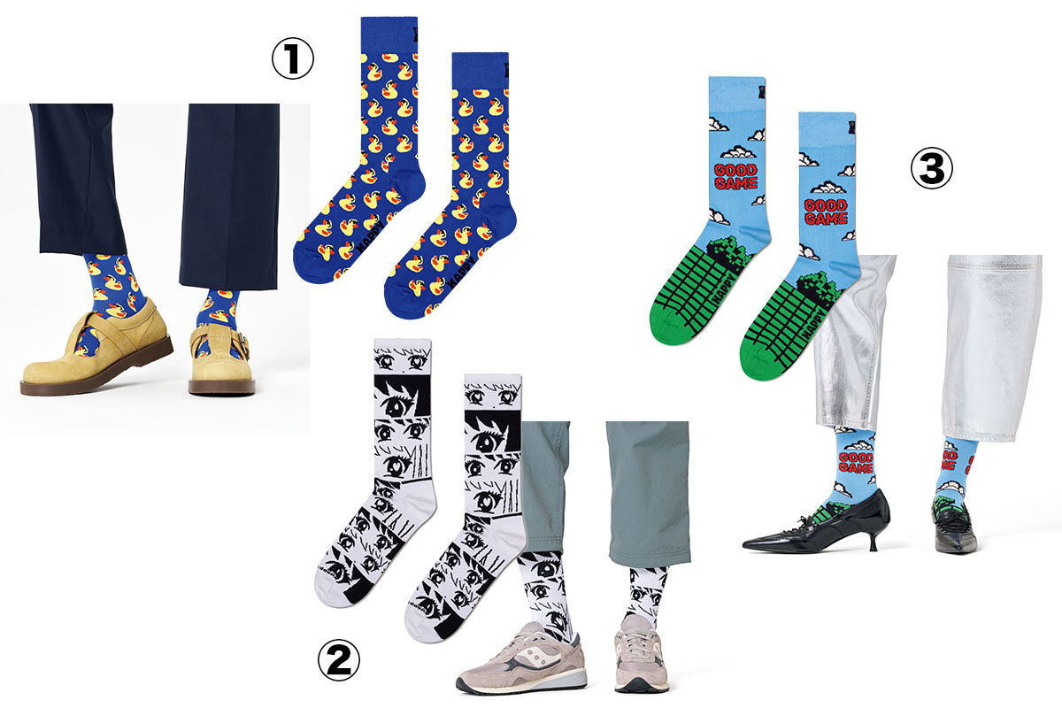 ③レトロなゲームのワンシーンをイメージ。ピクセルで描かれた柄は、ポップにしてアートな雰囲気も。色使いもカラフルだから、ダークトーンでまとめたコーデのアクセントにも。1760円(すべてハッピーソックス ルミネエスト新宿)