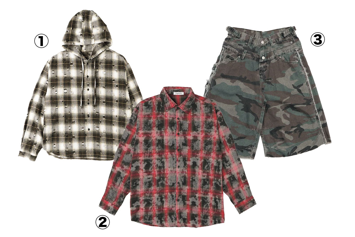 ①シャツでありながらアウターとしても使えるフード付き。トレンドアイテムでもあるが、オンブレチェック柄は万能とあって長く着られる。ダメージ加工されているので、新品ながらビンテージな雰囲気を楽しめるのが魅力だ。5939円