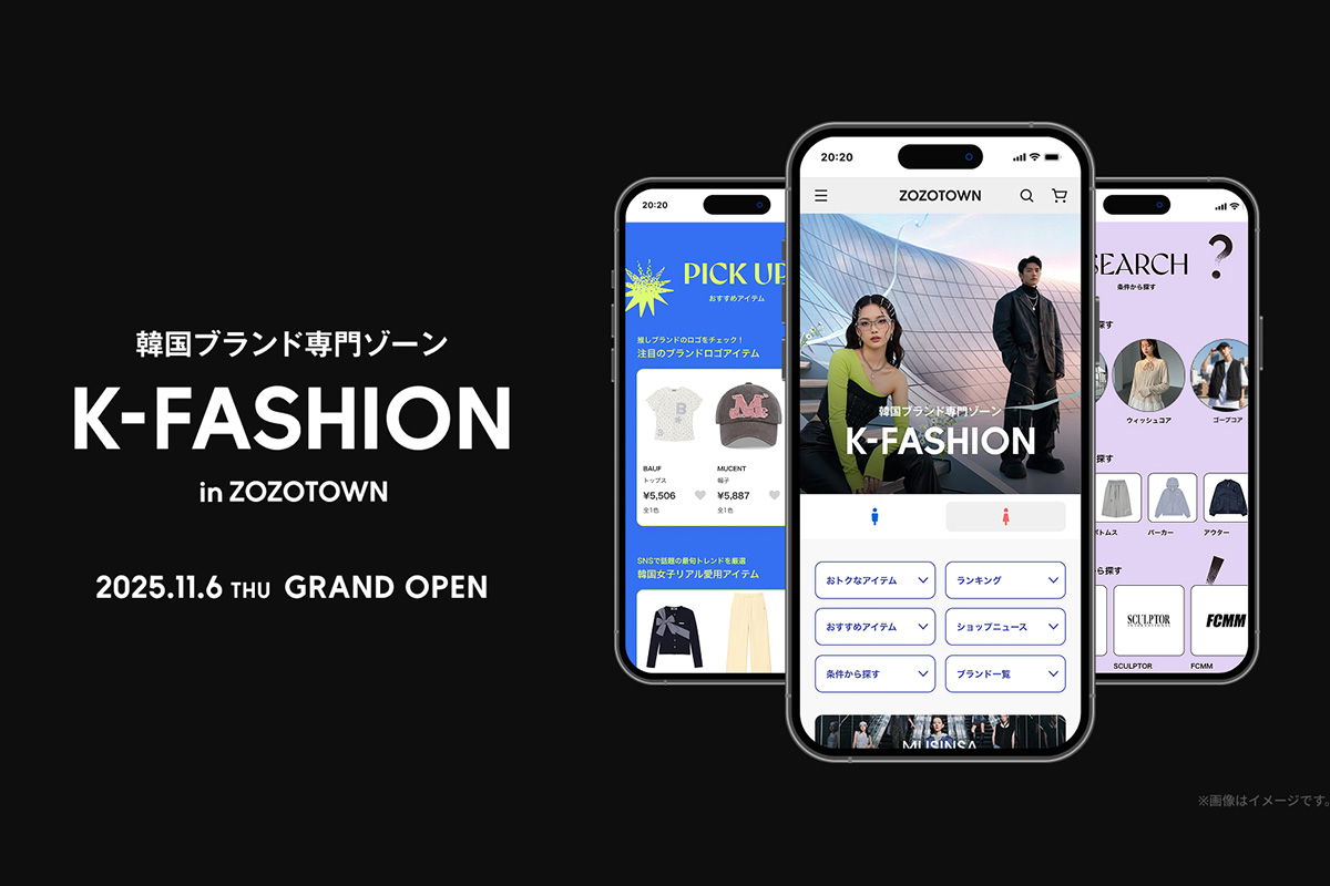 「ZOZOTOWN」が、韓国ブランド専門ゾーン「Kファッション」をオープン!「Kファッション」は、今月11月にオープンした韓国ファッションプラットフォーム「ムシンサ」が展開するブランドを中心に、多数の人気ブランドが揃うZOZOTOWN上の韓国ブランド専門ゾーン。日本初展開ブランドも含め、現在は140以上ものブランドを取り扱っている。
