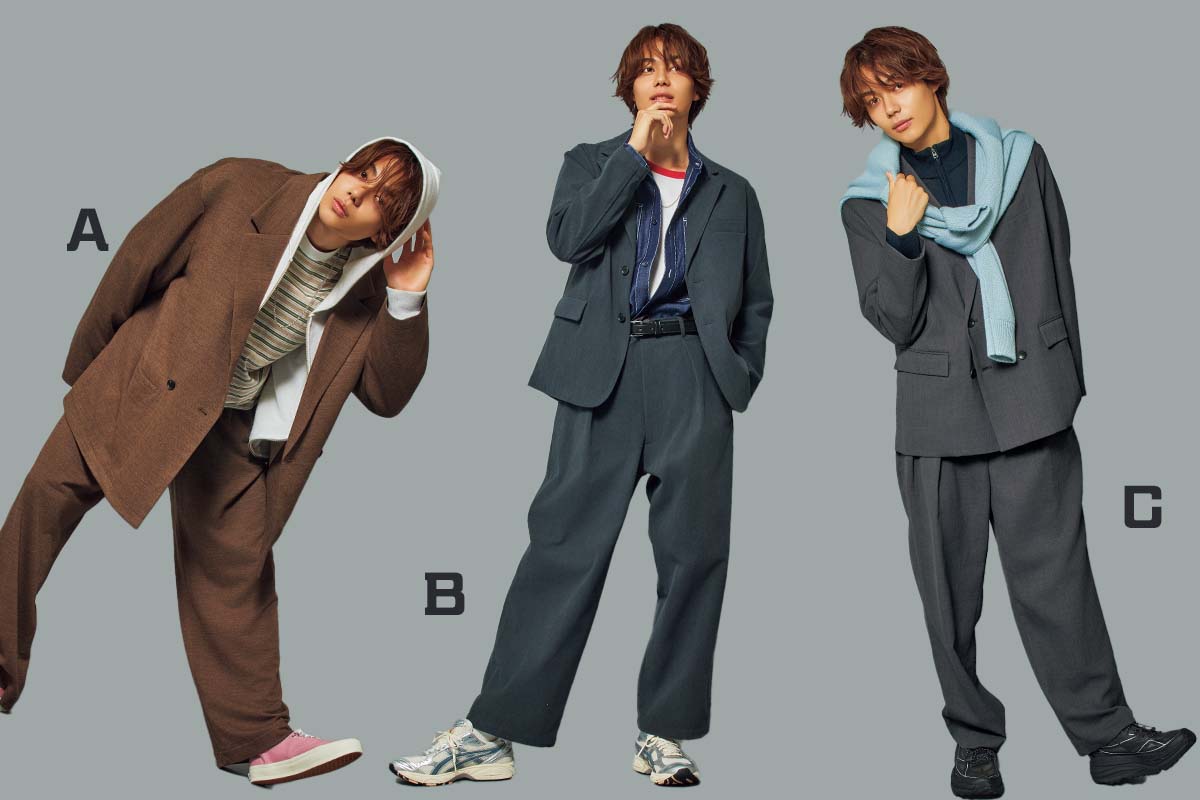 ジャケットタイプのセットアップって、正装だって思っていた(笑)。だって、お父さんも毎日着ているし。でも、二十歳の僕らにも流行っているから思い切ってチャレンジしてみたんだけどこれまた最高! キレイめで統一感あるし、コーデを組むのが楽ちんなんだ。