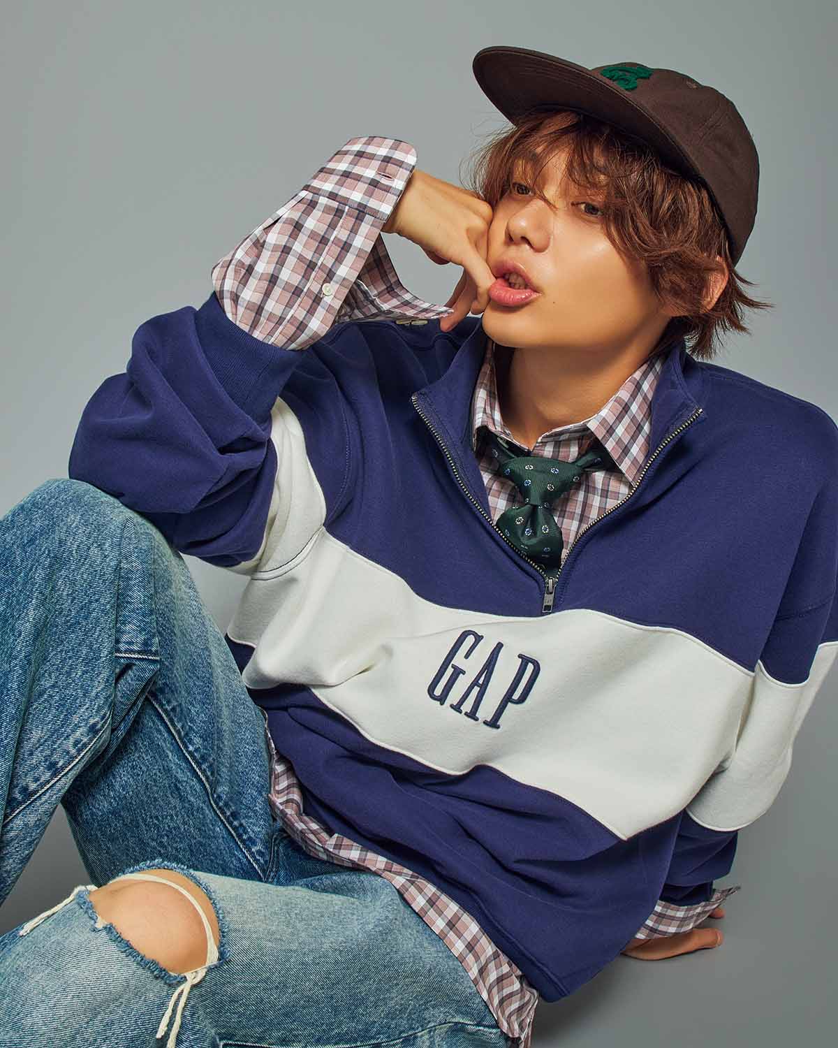 '90年代っぽいパネルボーダーが今っぽいハーフジップスウェット。インナーにチェックシャツと緑のネクタイを合わせれば、プレッピースタイルの完成。シャツとネクタイの色柄次第では、もっといろんなスタイルが楽しめそう。着こなしのバリエーションが豊富だと、通学服どころかデートでも活躍してくれるよね! スウェット8990円、パンツ8990円(ともにギャップ)、シャツ1万8000円(バナナ・リパブリック)、ジャクソンマティスのキャップ1万780円(ヒラクPR)、インディビジュアライズアクセサリーズのネクタイ2万900円(メイデン・カンパニー)