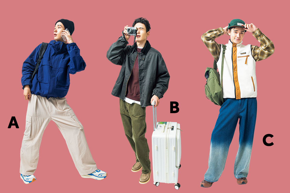 黒のワークジャケットで引き締めつつ、差し込んだバーガンディが大人な空気を醸す。カーキのパンツを合わせてアウトドア感をプラスして旅行気分を上げて。レイジブルーのジャケット1万1000円、スウェット6600円(ともにアダストリア)、パンツ1万2900円(ギャップ)、ソレルのシューズ2万900円(コロンビアスポーツウェアジャパン)