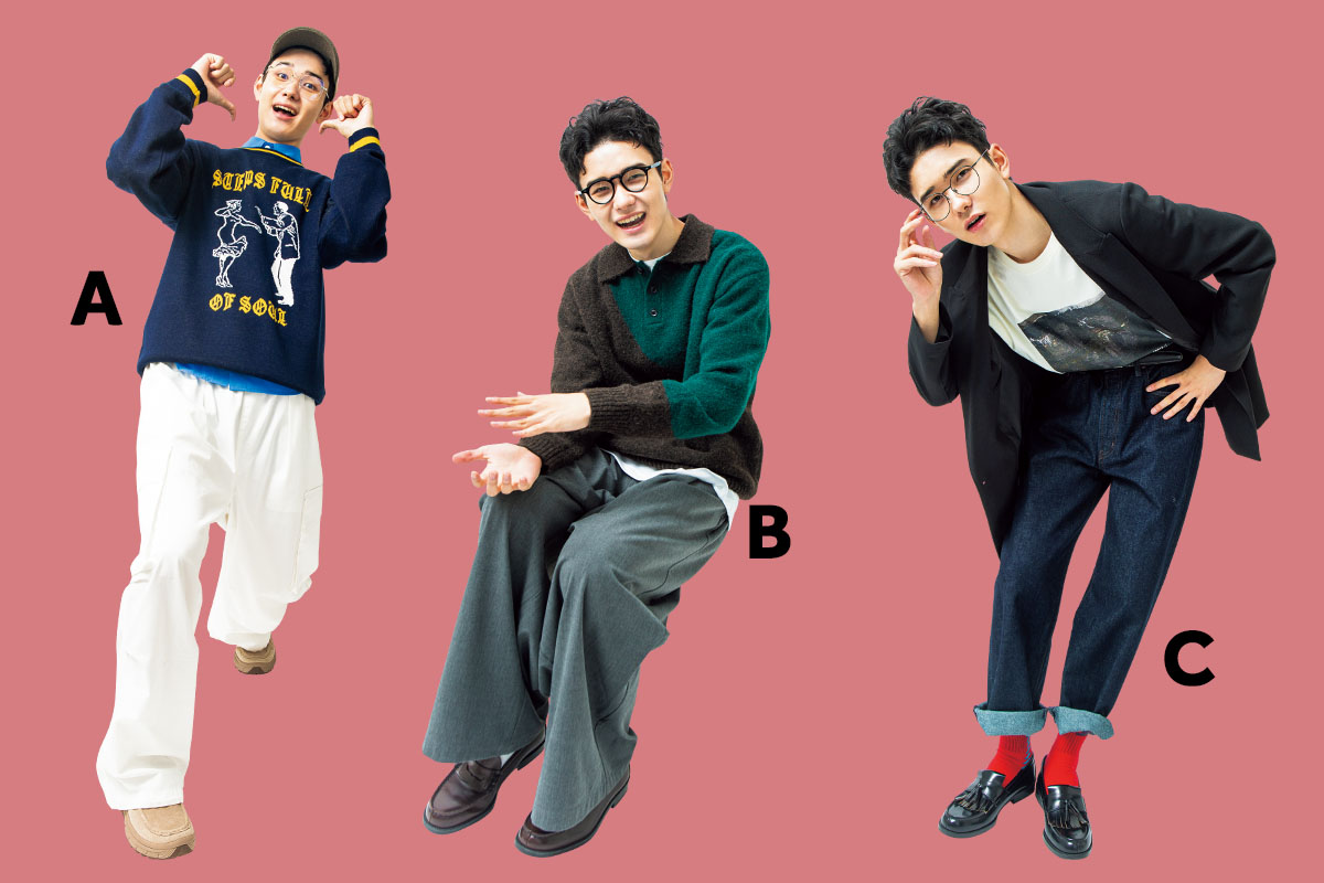 芸人さんのようなユニークなデザインのニットに、クリーンでさわやかなホワイトパンツを合わせて軽快に。スポーティなキャップで気取らずカジュアルに。ピービーリムのニット8990円(アダストリア)、シャツ2969円、パンツ3299円(ともにウィゴー)、ユアーズのシューズ2万2000円(エスト)、キャップ5720円(ニューエラ)、メガネ1760円(スピンズ)