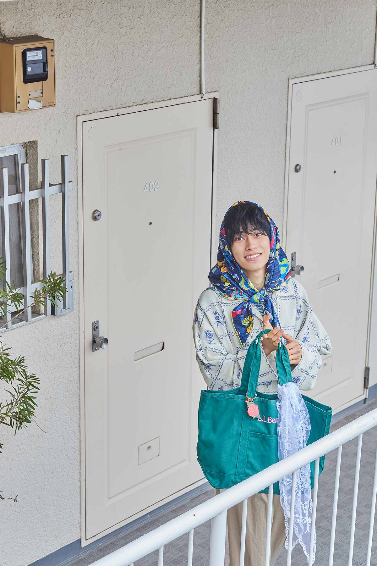 「なんだろう? 以前、自転車に乗りながらバッグを背負っていたときにタイヤに擦り付けてダメにしちゃったことがあるんです(笑)。だから、ちゃんと肩にかけてねって感じですかね。もちろん、それは冗談です(笑)。今回の撮影もそうでしたけど、今バッグにキーホルダーとかスカーフをつけるのが流行っていると思うんですが、僕もアレンジするのがすごく好きなんです。つけるだけでバッグの表情も変わりますし、愛着ももっと湧いてくる。一つのバッグを飽きずに長く使うためのコツだと思いますね。まだ、やったみたことがない人は挑戦してみて欲しいです!」