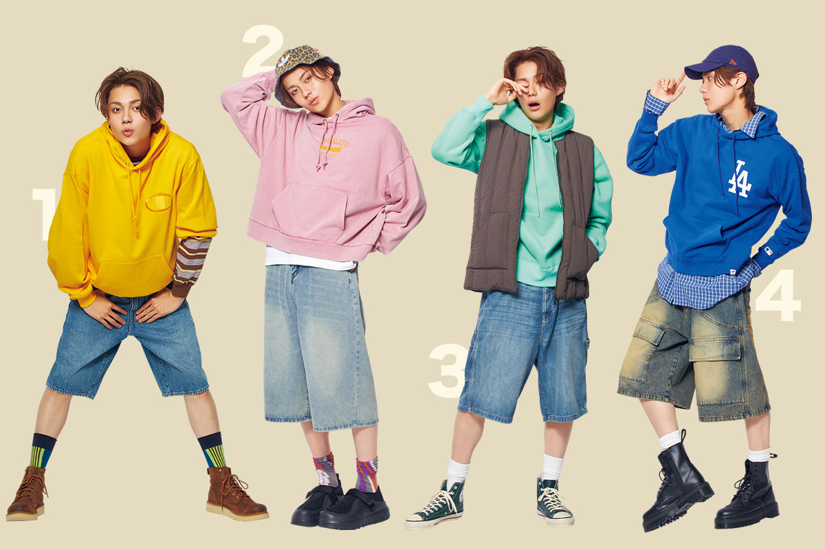 冬はロングボトムズが主流だけど、軽さや抜け感を出すならショーツって選択もアリ。とくに色パーカと合わせれば、少年っぽさも遊び心も演出できる。シューズの選び方次第で、ストリートにもアメカジにも寄せられるから、冬もショーツは活躍しそう。