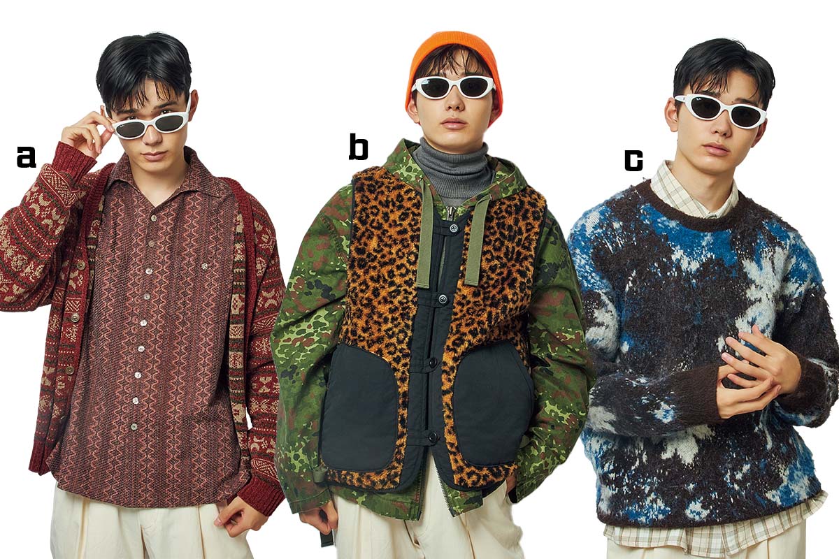 柄同士はNG、なんて常識は今日からもう非常識。迷彩柄×豹柄の主張強め系から総柄×チェック柄のバランス型、トラッドに振るタータン×ピンストライプまで、じつは輝き方無限大! 攻めてるのに計算してるっぽく見える、新感覚の重ね着テクニックだ。