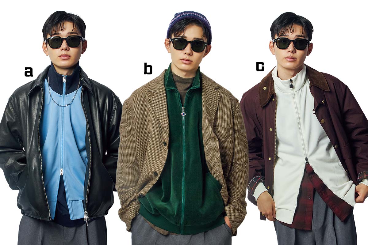 紺ブレやMA-1、デニムなど、ベーシックなジャケットに重ねたいのが、スポーティなトラックジャケット。じつはこれ、しゃれ感を一気に上げる組み合わせ。上品さとラフさのミックスが、抜け感のある強さを作ってくれる、まさに格上げレイヤードの必勝コンビ。