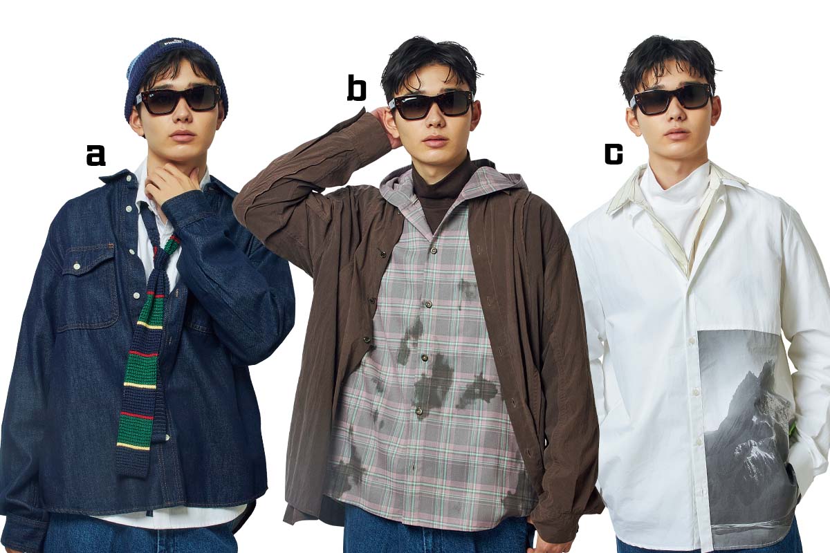 モザンビークのシャツ6万3750円(ジョワイユ)、中に着たシャツ3959円(ウィゴー)、ラッド ミュージシャンのカットソー1万6500円(ラッド ミュージシャン原宿)、レイバンのサングラス5万3680円(ルックスオティカジャパン カスタマーサービス)
