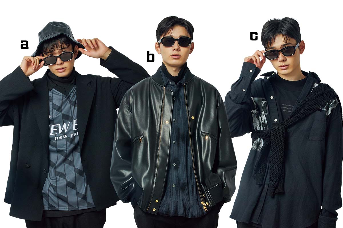 黒を際立たせるなら、ツヤッツヤのレザーはまず押さえておきたいところ。とはいえ、ゴリゴリに男らしく着るのも僕ららしくない。インナーにはあえてドレッシーな光沢シャツとタートルネックニットを選択。黒一色の中にも、相反するエッセンスを入れるのが攻略のポイントだったりする。
