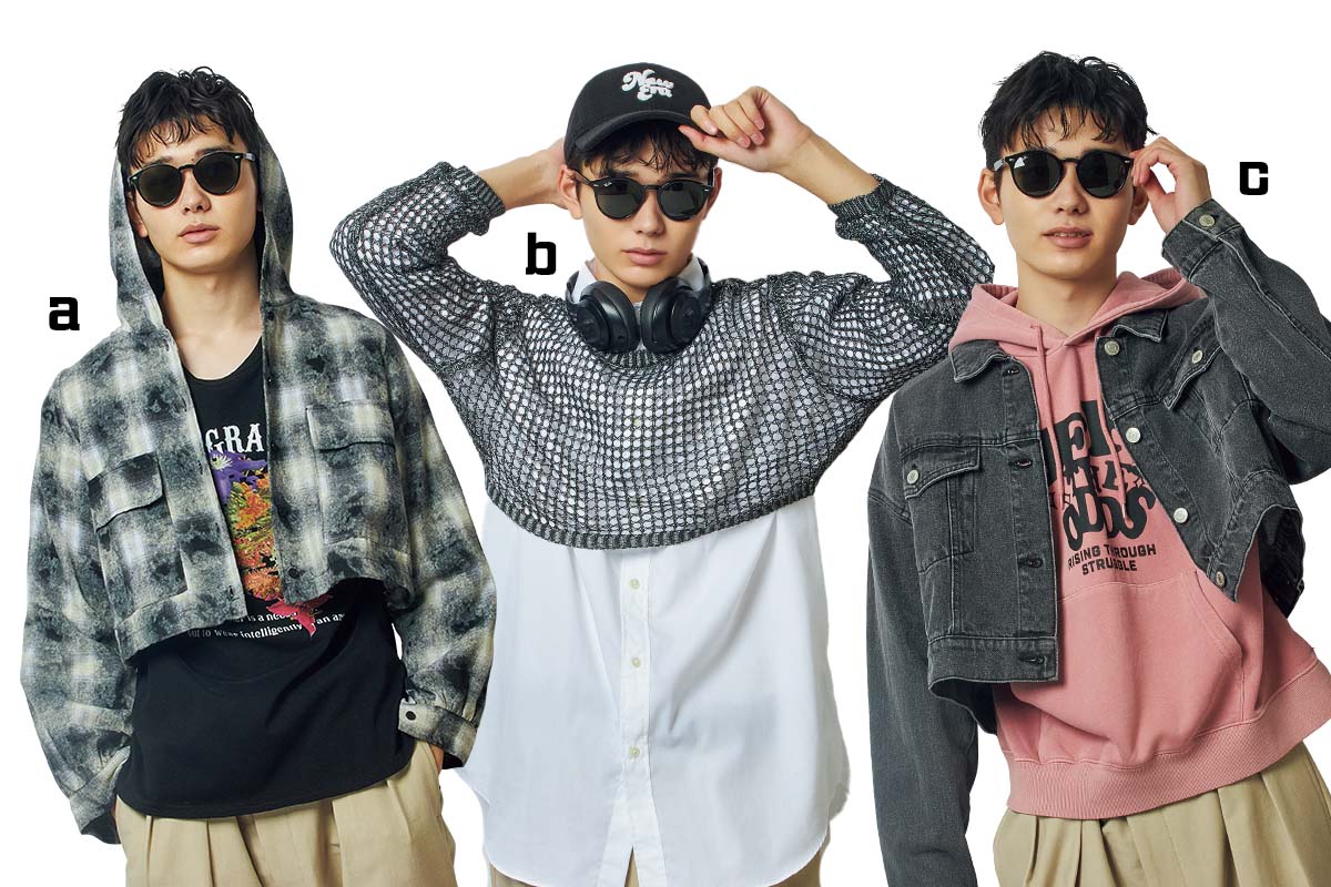 Y2Kムードの高まりでショート丈アウターがおなじみアイテムになった現代。女のコの間だけじゃなく、僕ら男子の間でも定番化しつつある。パーカとシャツのような王道も、このバランスの変化で一気に違った印象に。令和ならではの新しいバランス感をマスターすべし。