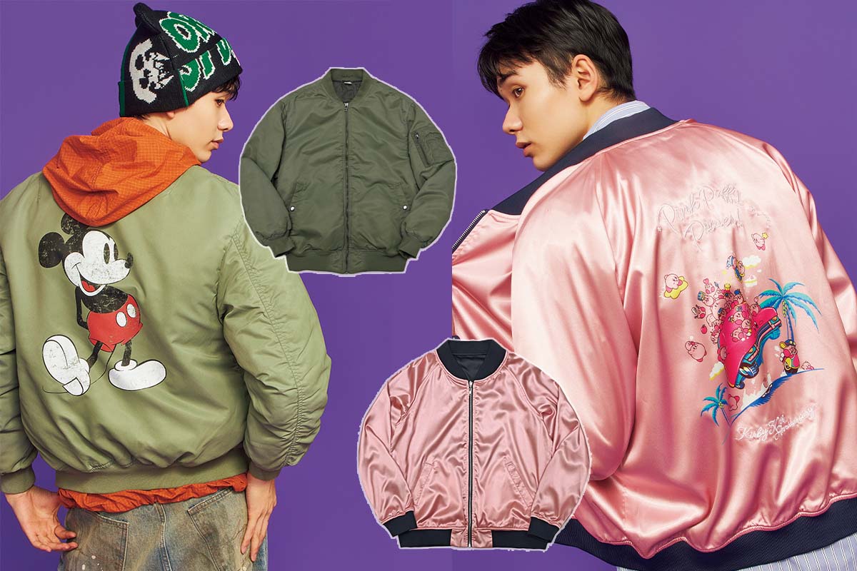 光沢感のある、カービィのピンクカラーのサテン生地に、刺しゅうが映えるスカジャン。スッキリとしたシルエットだから、派手なデザインもスマートに着られる。前面はシンプルだからこそデイリー使いできる。ジャケット2万9700円(スーパーグルーピーズ)、ビーミングのシャツ9900円(ビーミング ライフストア バイビームス ららぽーと東京ベイ店)