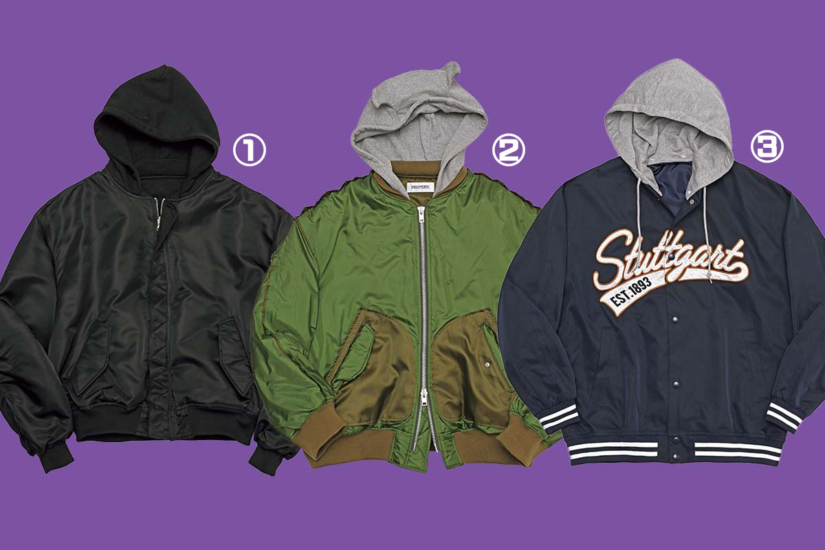 オレンジカラーのカレッジロゴが映えるネイビーのスタジャンに、グレーのフードをプラス。スポーティな雰囲気とラフさを両立できる。どんなスタイリングとも相性の良い1着。ジャケット6599円(ウィゴー)