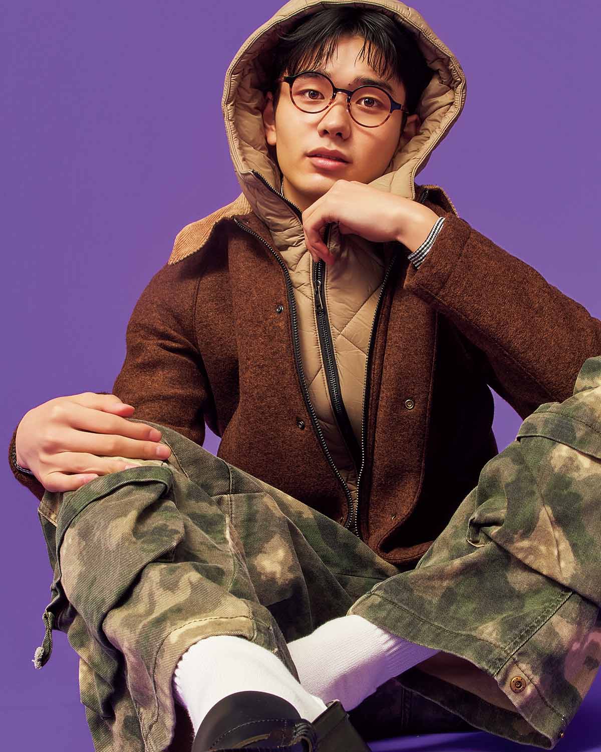 ブラウンカラーのウールのジャケットの中に、ナイロンのフードブルゾンをイン。異素材同士のレイヤードで奥行きを出しつつ、全体をブラウン系で統一。カジュアルなカモフラ柄のパンツも、この配色なら大人っぽくまとまる。しかも中綿フードで防寒まで叶えてくれるなんて最高。ボブのジャケット10万4500円(タキヒヨー)、ノーティカのシャツ1万3970円(フリークス ストア渋谷)、パンツ8899円(フィグメンツ)、シューズ1万2650円(ハルタ)、メガネ1万1000円(オンデーズ)、その他スタイリスト私物