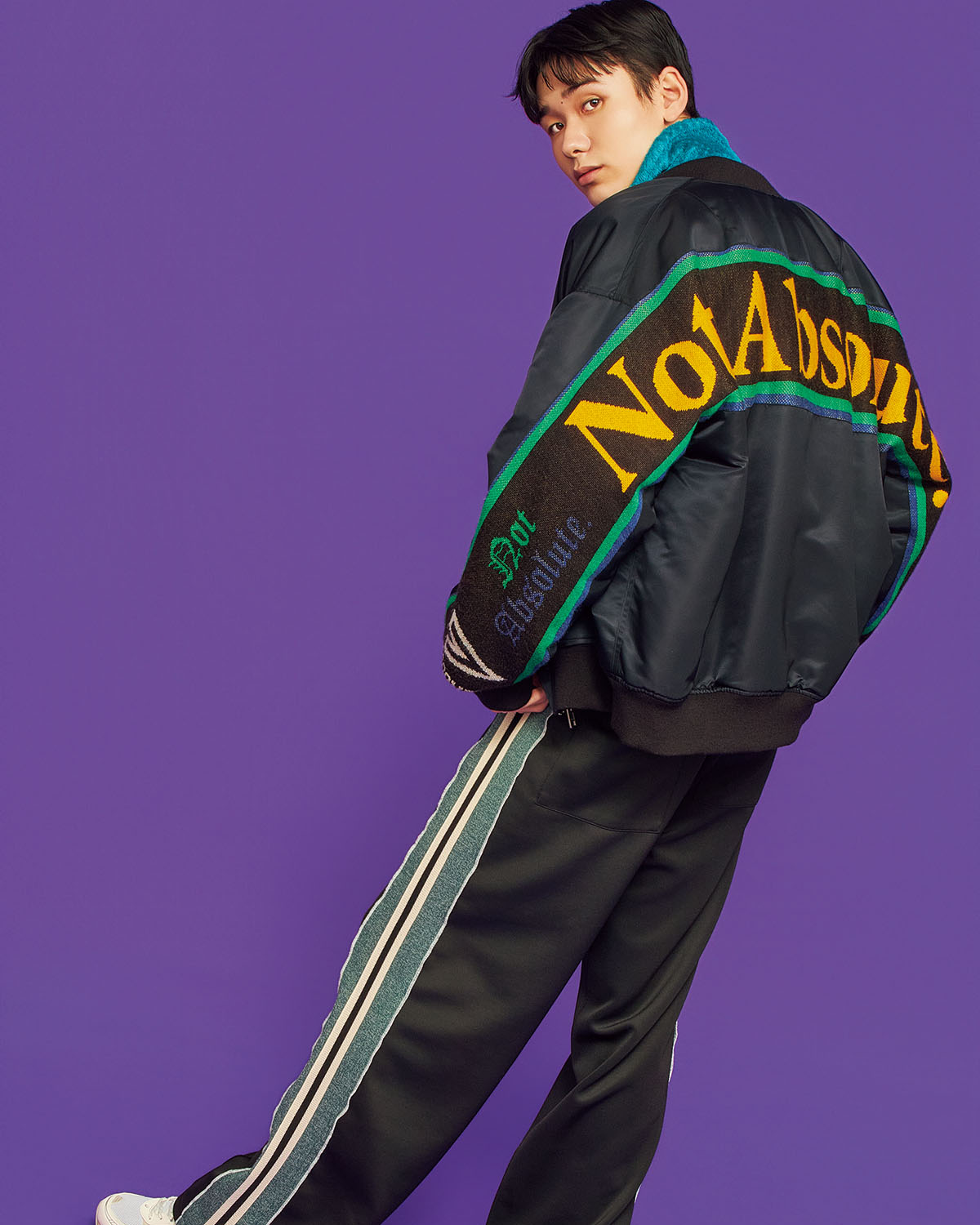 袖からバックに走るように入ってるロゴラインのブルゾンは、それ1枚で主役級の存在感。パンツにもサイドライン入りを選ぶことで、全身のスタイルを合わせてまとまった印象に。全体をブラックとグリーンのトーンで合わせて、派手すぎず芯のあるストリートスタイルに仕上がる。ブルゾン7万9200円(ディスカバード)、マムートのジャケット3万3000円(マムートスポーツ グループ ジャパン)、ジャングルスのパンツ3万3600円(ループトーキョー)、アシックスのシューズ2万2000円(アシックスジャパン カスタマーサポート部)