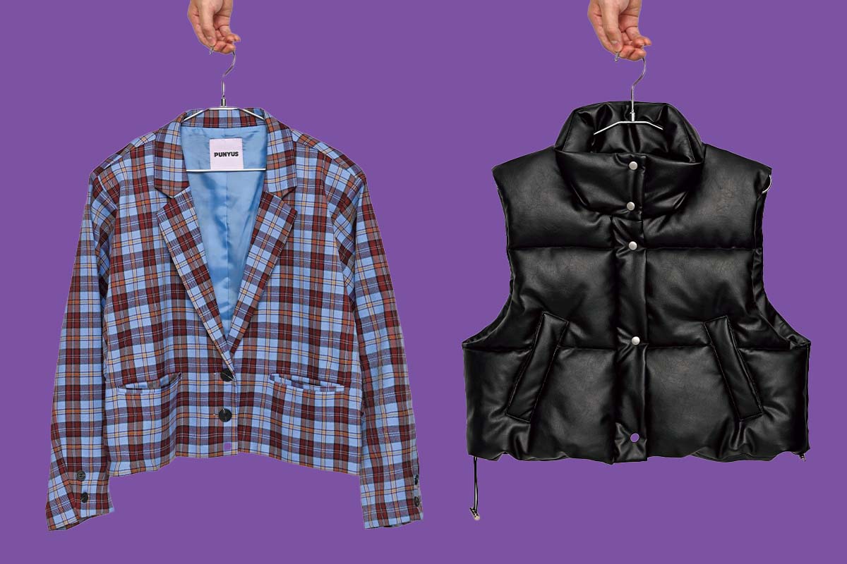 クラシカルなチェック柄も、短丈になるだけで一気に新鮮に。ブルーとボルドーのレトロな配色で、ほどよいトラッド感を演出してくれる。ウエスト位置が高く見える丈感は、脚長効果も抜群。ジャケット8800円(プニュズ)