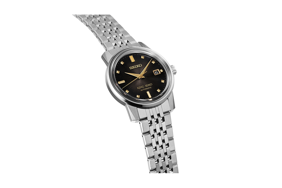 シャープな多面カットによるエッジの際立つケースデザインが特徴の〈キングセイコー〉『KSK』をベースにダイヤルには光をイメージした型打ちを施したブラックカラーを用い、ゴールドカラーのロゴや針、スタッズのようなピラミッド型のカットの入ったインデックスと呼応することで、輝きが放射状に広がる印象的な表情を演出。