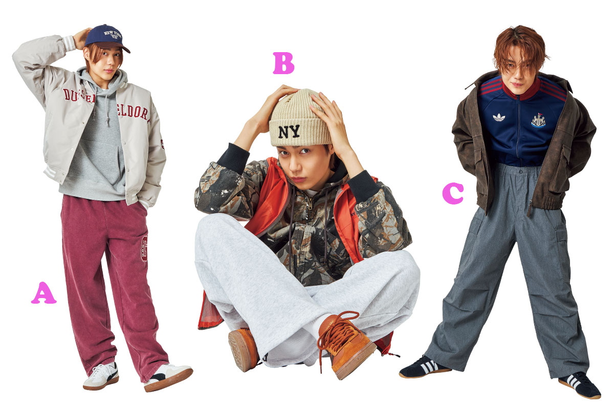 LAの青空の下で世界の大谷を応援するなら、このくらいハッピーな色がちょうどいい! ポップなピンクのスウェットパンツは、球場の熱気にも負けない陽キャ感。青のキャップと合わせれば、本場のファンさながらの西海岸スタイルが完成。ブルゾン7699円(ウィゴー)、ムジラボのパーカ7990円(無印良品 代官山)、パンツ8990円(ギャップ)、プーマのシューズ1万3750円(プーマ お客様サービス)、キャップ990円(GU)