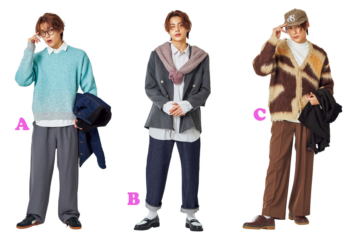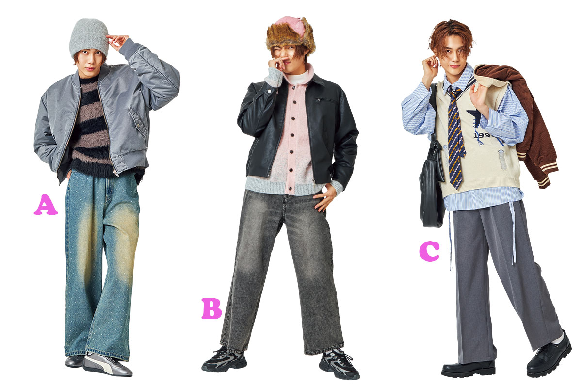 アイヴの参戦服で目指すべきは、韓国ドラマに出てくる名門校のキング的存在。タイドアップしたストライプシャツに遊び心あふれるダメージベストを合わせれば、育ちよさげなハイティーン感爆誕! ベスト4399円(ウィゴー)、シャツ5940円(プニュズ)、手に持ったジャケット7689円、パンツ1万2100円、バッグ6930円、シューズ1万2100円(すべてティーケータケオキクチ)、ネクタイ2189円(スピンズ)