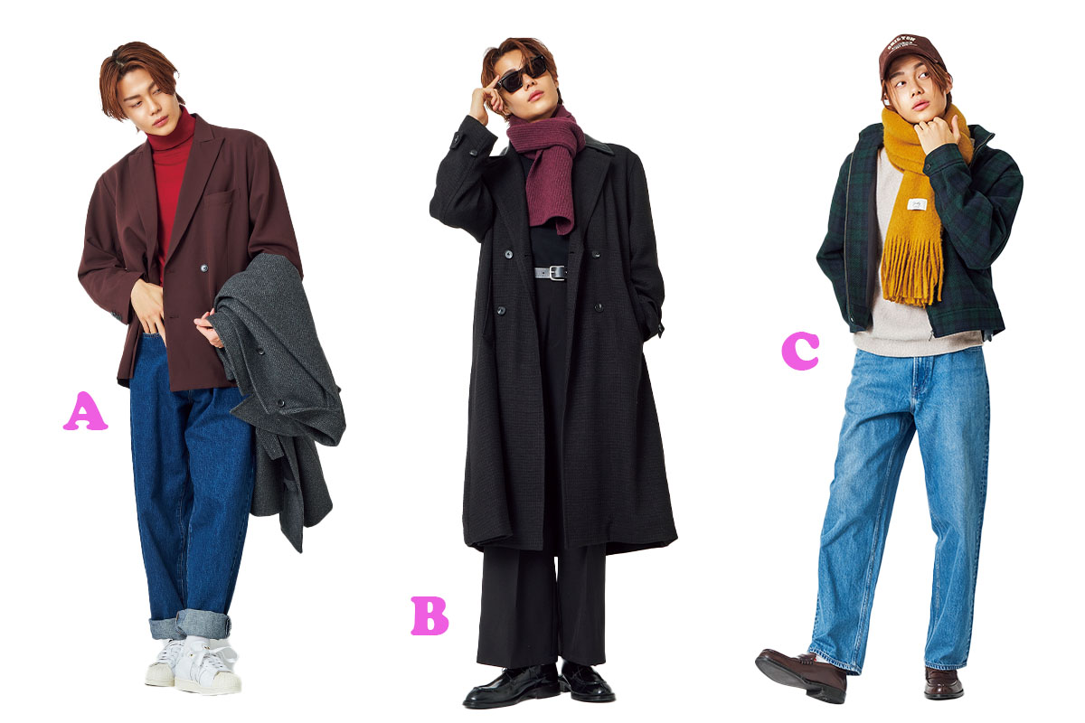 パリの街角にいそうな、こなれた芸術学生バイブス。ブラウンジャケットを真っ赤なニットとデニムで着くずせば、キメすぎないのにフレンチシックに。コートをはおればより大人に。ジャケット6929円(ウィゴー)、手に持ったコート7990円(GU)、ニット3990円(ユニクロ)、パンツ9990円(ギャップ)、アディダス オリジナルスのシューズ1万6500円(アディダスコールセンター)