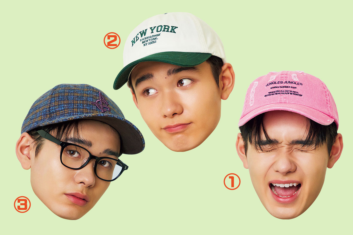 ①ド派手なピンクながら、ミニマムな英字ロゴとさりげないダメージ加工のおかげで、かわいくなりすぎず使い勝手もばっちり。ストリートな雰囲気たっぷりなコーディネートに投入してもおもしろい。ジャングルスのキャップ1万6500円(ループ トーキョー)