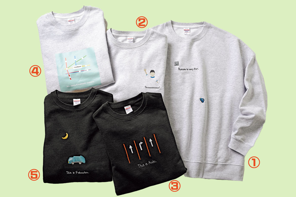 都道府県の"あるある"をプリントや刺しゅうでデザイン化したブランド。埼玉県出身のデザイナーが埼玉Tからスタート。今ではTシャツだけじゃなくスウェットまで展開していて、今回のこのラインナップもツッコミ待ちの宝庫。たとえば埼玉のグレースウェットなんか、その地元民がいたら……ツッコまれるのは確定! そこから一気にまわりのみんなと距離が縮まるぞ! スウェット各6800円(すべてジモトイズム)