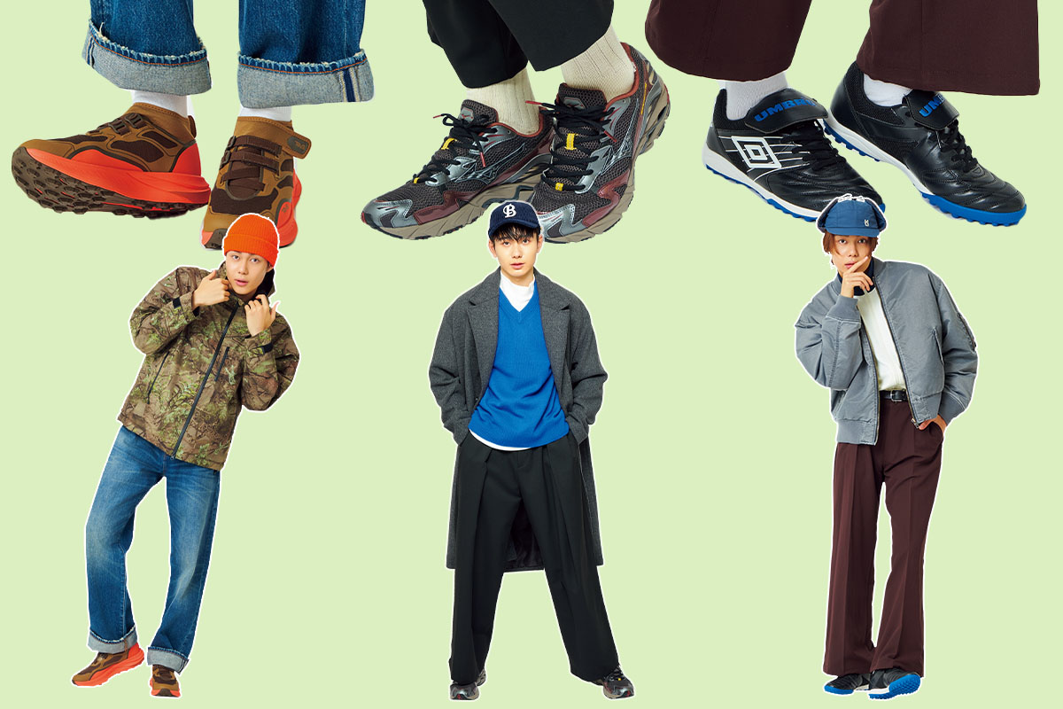 最近、サッカーの練習用シューズ、通称トレシューを普段使いする上級者も増えてきている。アンブロのロゴも好アクセントになる。ブルゾン1万8700円(ティーケータケオキクチ)、ニット4399円、パンツ3959円(ともにウィゴー)、アンブロのシューズ8800円(デサントジャパンお客様相談室)、ミレーのキャップ7590円(ミレー・マウンテン・グループ・ジャパン)、その他スタイリスト私物