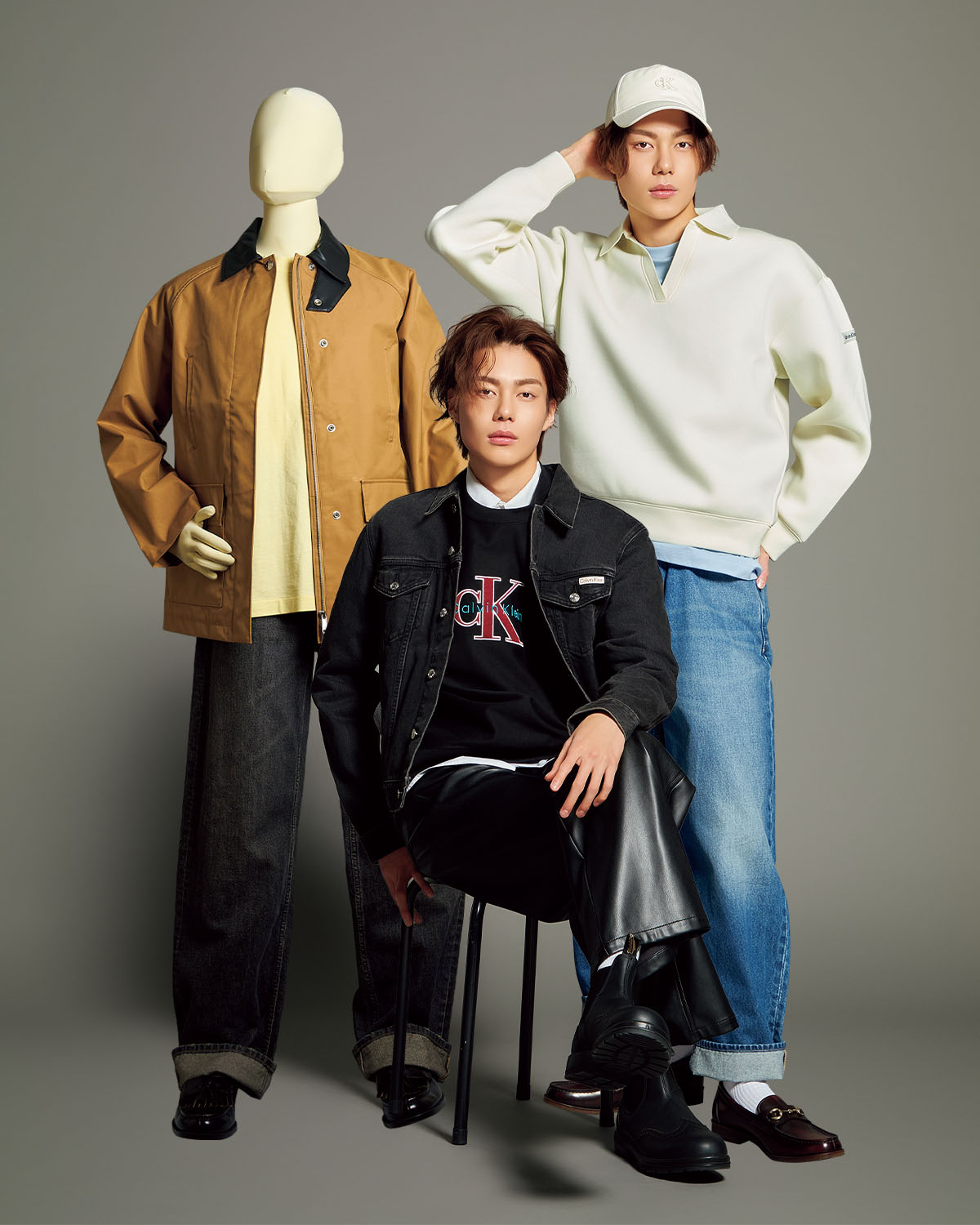 異素材合わせのコーデで質感に差ができ奥行きが生まれる。フロントのロゴは落ち着いた色みのおかげで洗練された印象に。カルバン・クラインのジャケット2万9700円、スウェット2万2000円、シャツ2万2000円、パンツ2万7500円(すべてカルバン・クライン カスタマーサービス)、その他スタイリスト私物