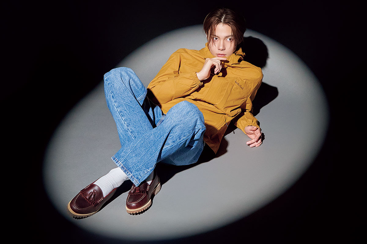 ティンバーランドの代表色「ウィート」のシェルジャケットとデニムを合わせたアメカジコーデ。あえて足元は定番のイエローブーツじゃなく、キレイめなローファーで軽さと品を出すのがポイント。ティンバーランドのジャケット2万6400円、パンツ1万7600円、シューズ2万6400円(すべてVFジャパン)
