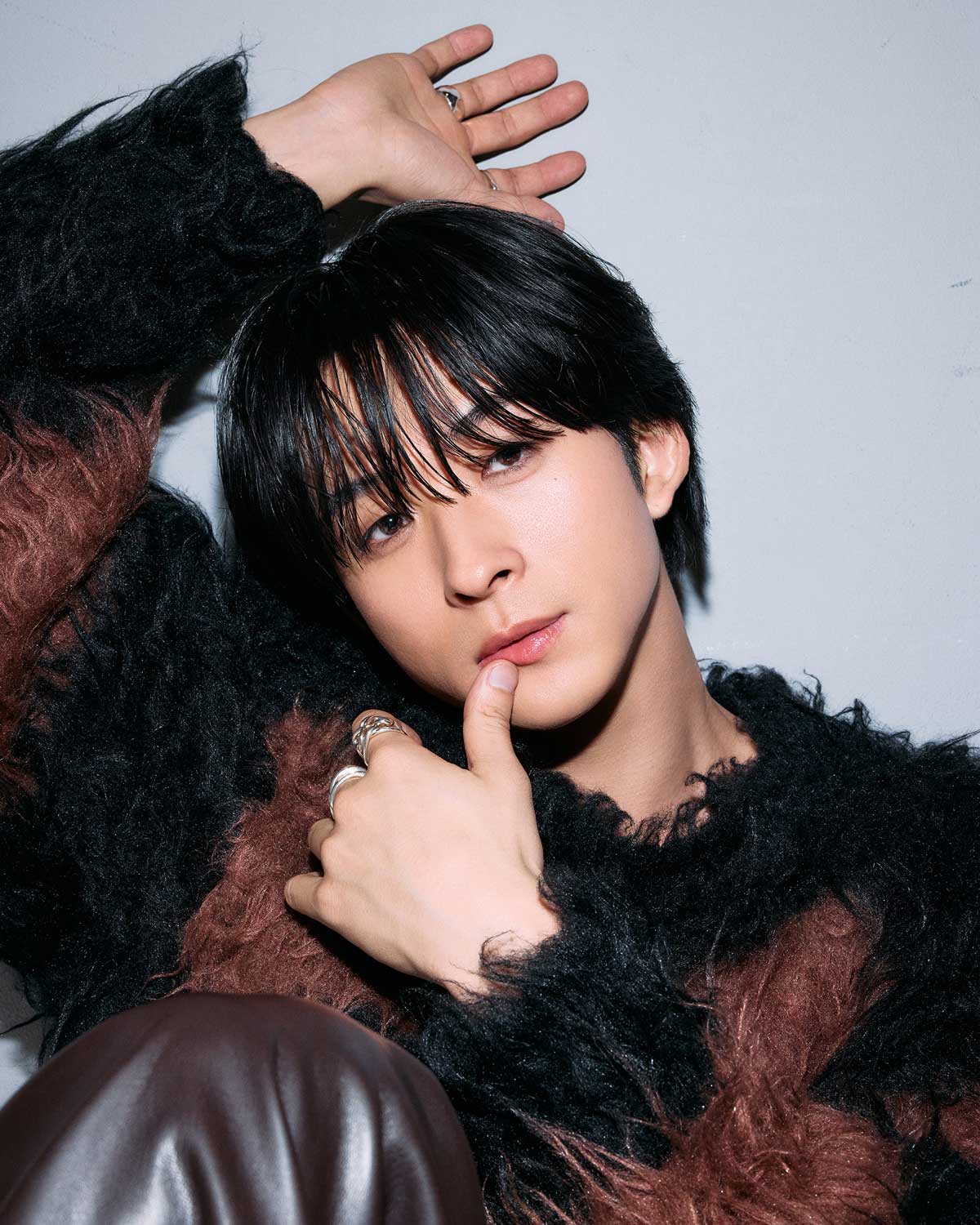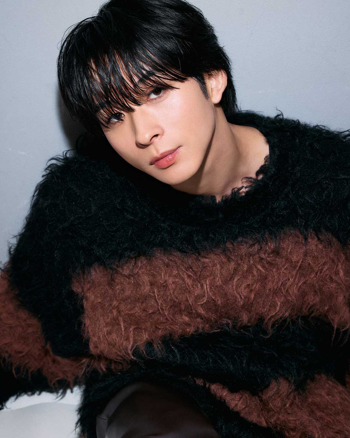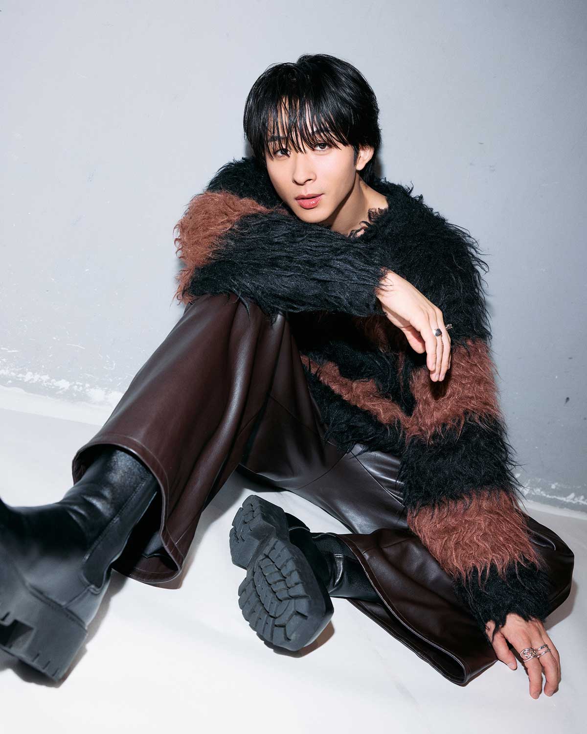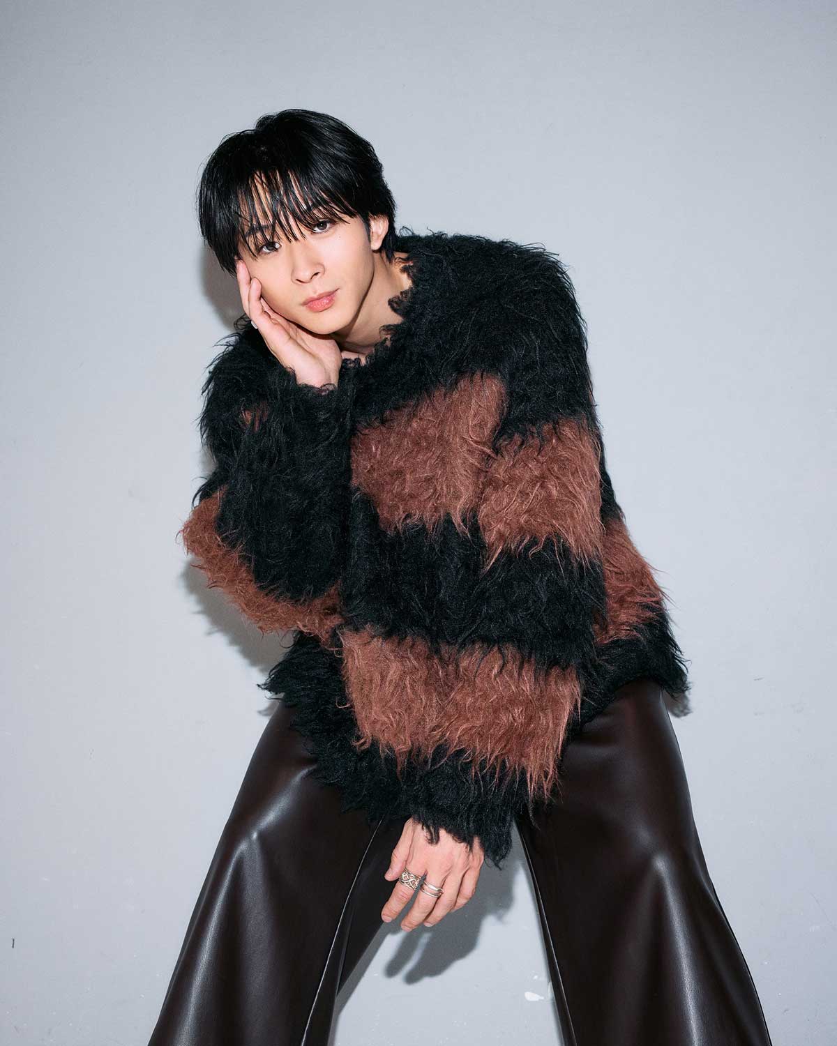 衣装はラッド ミュージシャンのニット4万2900円(ラッド ミュージシャン原宿)、フォーセブンナイトのリング[右薬指]3万7400円、[左中指]3万1900円、ヤーカの[左人差し指]1万4300円(すべてロードス)、その他スタイリスト私物