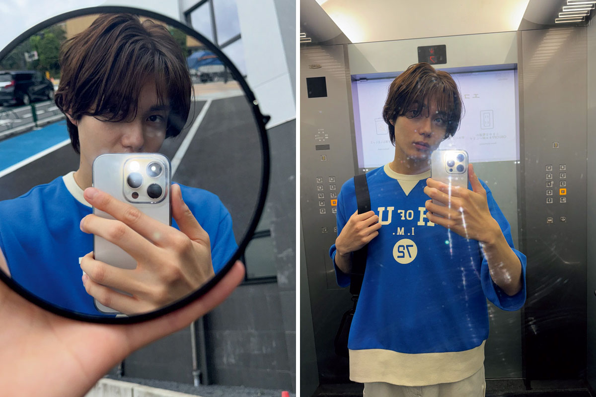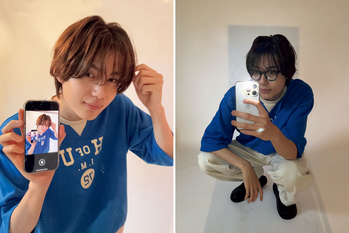 パキッとしたブルーのトップスを主役にすると、画面映えも余裕。鏡越しの撮影でも、くすまない発色がいい感じにハマる。ゆるっとしたシルエットが抜け感に。T シャツ1万8700円(エイチ. ユニット)、パンツ9990円(ギャップ)、シューズ2990円(GU)、オリバーピープルズのメガネ4万5980円(ルックスオティカジャパン カスタマーサービス)、その他スタイリスト私物
