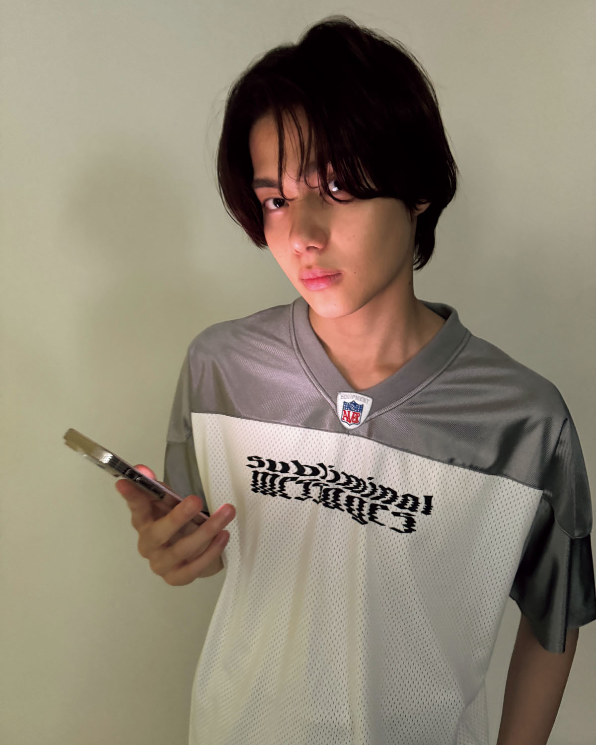 アングルも構図も、⾃分で調整できるから、いちばん盛れるバランスが⾒つけやすい。スマホを構える仕草もおしゃれ。鏡越しに「どこ⾒ればいいの?」って迷ったら、カメラ⽬線にしたいときは鏡に映るレンズを⾒て。目線を少しズラしてアンニュイな雰囲気ならスマホの真ん中あたりを、下のほうを⾒れば伏し⽬で⼤⼈っぽく。視線の置き⽅だけで雰囲気がガラッと変わる。