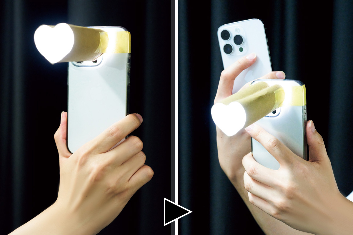 トイレットペーパーの芯の中心 部分を折って、ハート形にする。スマホにテープで固定すれば、完成! スマホの懐中電灯機能の明るさをMAXにして芯の中から照らせば、壁にハート形の 影が映し出される。もう1台スマホを用意して、そのまま撮影。壁との距離を変えてハート形の大きさを変えたり、丸や三角に形を変えたりして、バリエーションも楽しんじゃおう!