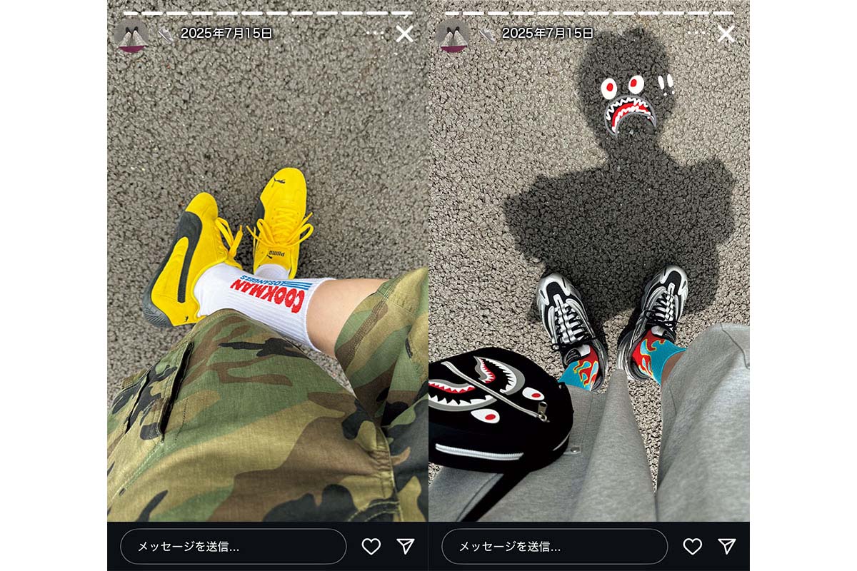 トイマシーンのパンツ7700円(クエスト)、ア ベイシング エイプ®のシューズ3万1900円(ベイプストア®原宿)、クックマンのソックス1320円(バディーズ)