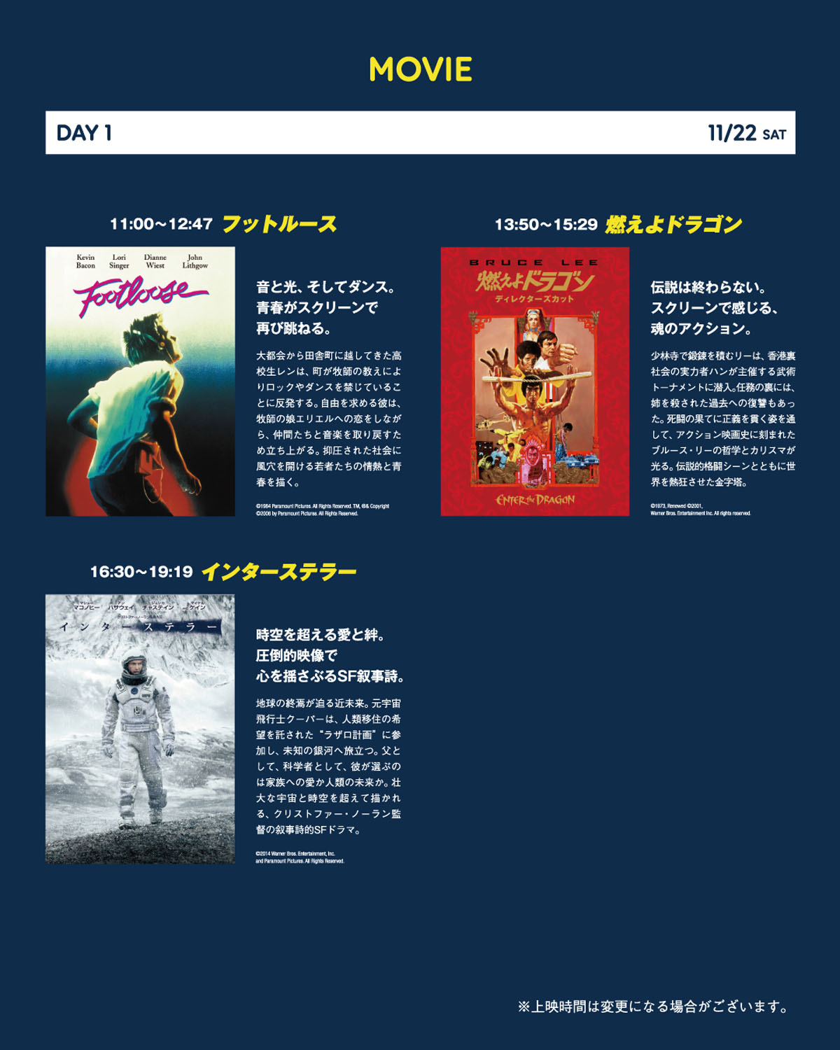 青春、自由、愛、旅、強さ、そして時間。映画の中にある普遍的なテーマから、“カルチャーの根っこ”となるエッセンスを拾い上げ、ファッションや音楽、ライフスタイルと響き合うシアター空間がつくり出される。