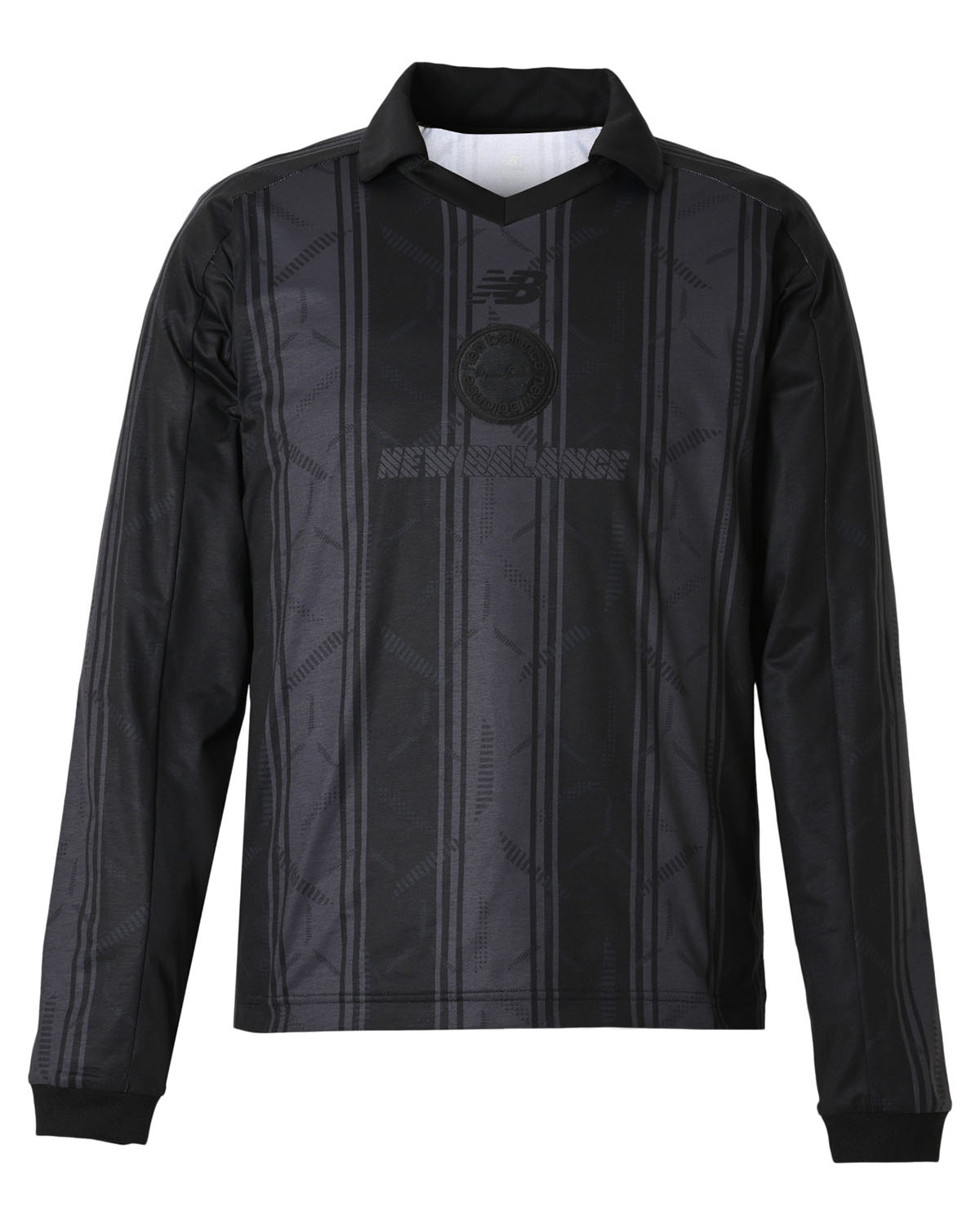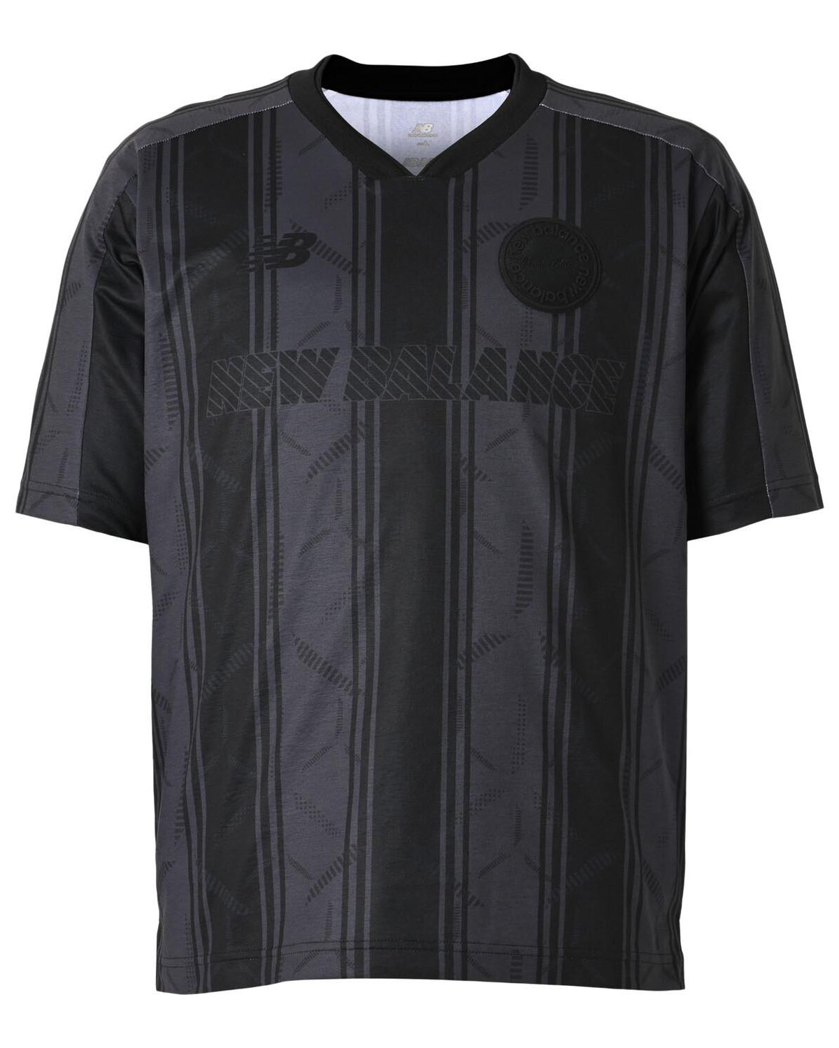 ステル100%素材を使用し、リブ仕様の衿とスリットが入った裾のデザインが、アクティブからオフピッチまで対応する。右胸のNBロゴ刺しゅうと左胸のサークルロゴワッペンをクールなカラーでまとめる。こちらも”ブラックアウト”コレクションのもの。[Graphic SS Top] 8910円