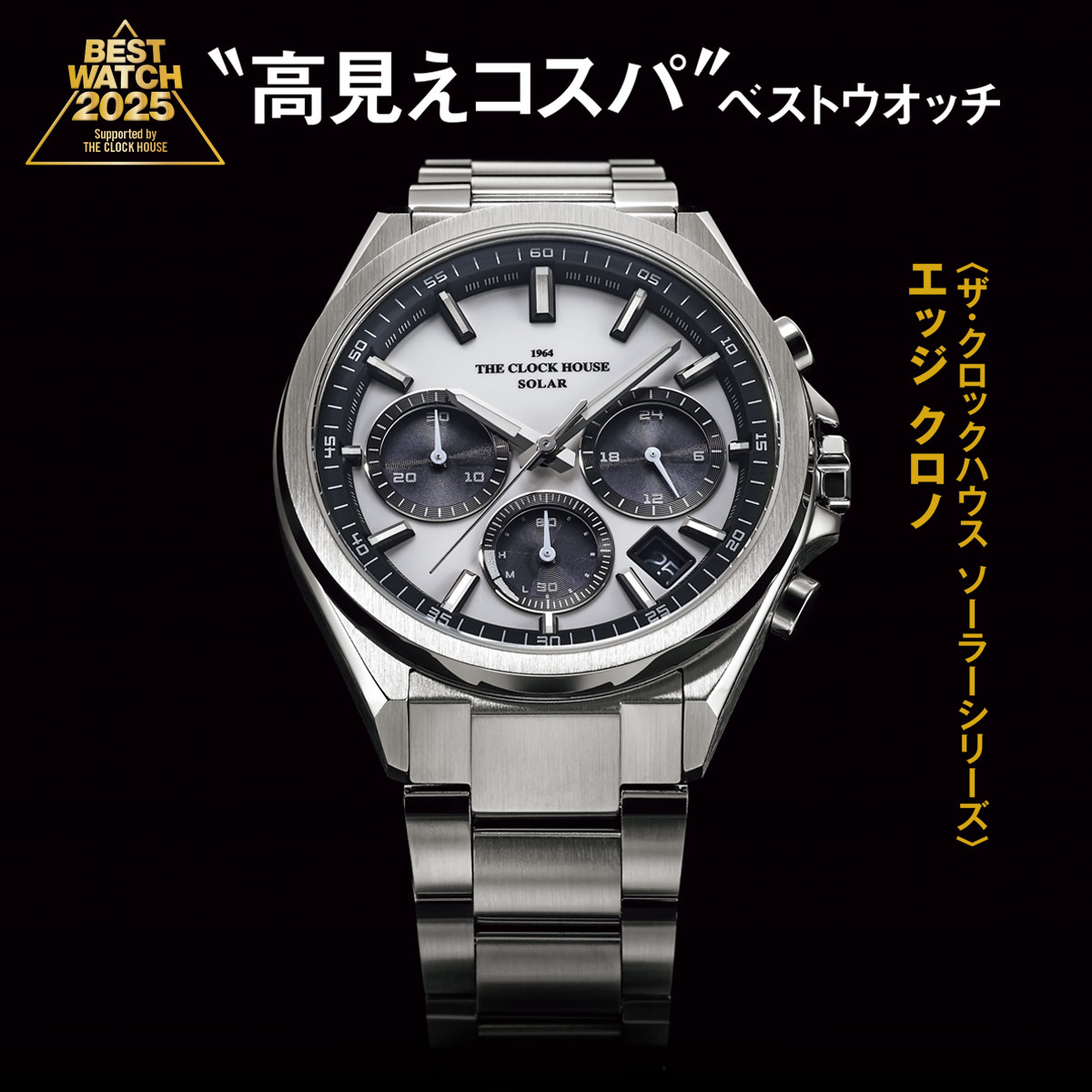 ダイヤルとインダイヤルのコントラストをつけた、通称パンダ仕様。レトロな印象ながら、白×黒のさじ加減によりモダンな表情に近ごろの腕時計はモダンがキーワードのよう。手になじむ柔和なデザインよりも、角の立った直線的なシルエットが注目を集め、多くの新作時計にも反映されている。また、モノトーンが基調のハイコントラスト配色、余計な装飾を排した無機質な印象も、モダン要素に該当する。一方で、お手ごろ感、クラス感ある見えっぷりなど、目の肥えた時計好きが求める“高見えコスパ”な視点も捨てがたい。となると、2025年発売の〈ザ・クロックハウス〉エッジクロノグラフなんてまさにお誂え向きだ。エッジの効いたシャープなシルエットに、白黒バイカラーの“三つ目パンダ”仕様。磨き分けたステンレススティールのきらめきとともに、引き締まった表情が手元をリッチに仕立ててくれる。トレンド、コスパ、クラス感、すべての面で見逃せないと多くの称賛が寄せられ、見事栄冠に輝いた。