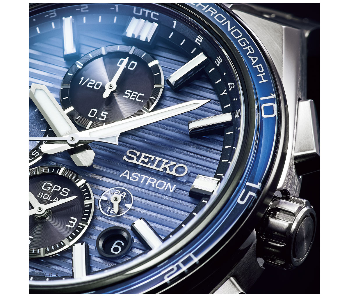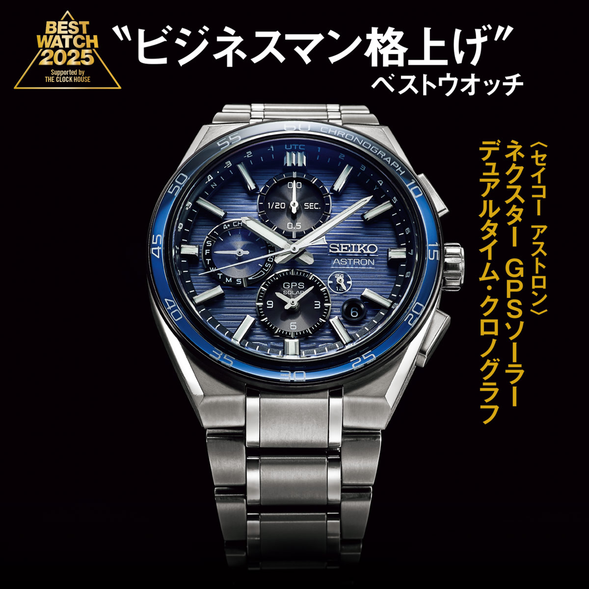 純チタンのケースとコントラストを生む、青いダイヤル&ベゼルが今作の鍵。特にサファイアガラスをセットしたベゼルの青が美しいビジネスの現場では、人の目を気にしない風潮が蔓延していると聞く。ICTやAIなどの技術発展により、人と対面する機会が格段に減っているからのようだ。しかし経済紙やビジネス誌に取り上げられる成功者の多くは、端正さや清潔感を大事にしていることが見て取れる。ビジネスは人が支えるものゆえに、言動や身なりを磨き続けるのも、悪くはない。掘り下げれば、腕時計がビジネスの成功につながる可能性も十分にある。〈セイコー アストロン〉ネクスターシリーズのメインモデルは、ホリゾンタルパターンの型打ちを施したブルーのダイヤルが、精緻でモダン、それでいて爽やかな印象をアピール。加えてGPSによる時刻修正やデュアルタイム表示など、ビジネスの場をサポートする機能も満載。スタイリッシュで実用面も優秀な1本が、成功者への道筋を示してくれる。