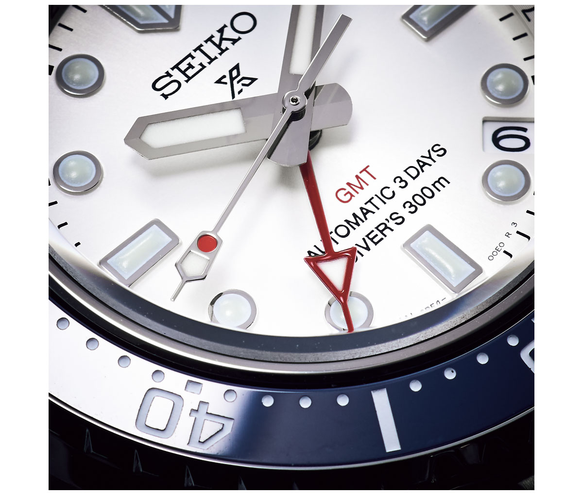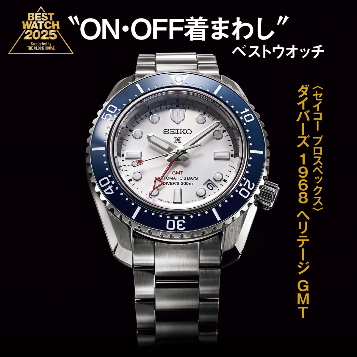 爽やかな青×白のルックスに、GMT針と秒針先の赤がいいアクセント。視認性を助けるための仕様ながら、引き締まった顔つきに!現代のライフスタイルにおいて、ユーティリティ性はモノ選びの条件に欠かせないファクターだ。家具家電、生活用品、さらには洋服と、複数役をこなしてくれるアイテムに、値段以上の価値を感じる人も多いはず。こと時計においては、ビジネスでさりげなくハマり、普段使いでも大いに使える、そんな1本を求める声は依然として高い。2025年に発売された〈セイコー プロスペックス〉の1本は、マリンの薫りあふれる青ベゼル×白ダイヤルのデザインから、手元を爽快に飾れるのが魅力。ゆえにセットアップ姿の袖から覗けば、ビジネス相手が抱く印象もよくなるはず。また休日用としても申し分なく、ダイバーズたる堅牢な作りはどんなアクティビィティも余裕で、またGMT機能付きとなれば旅好きとしては見逃せない。オン・オフ問わず活躍する、まさに万能な腕時計だ。