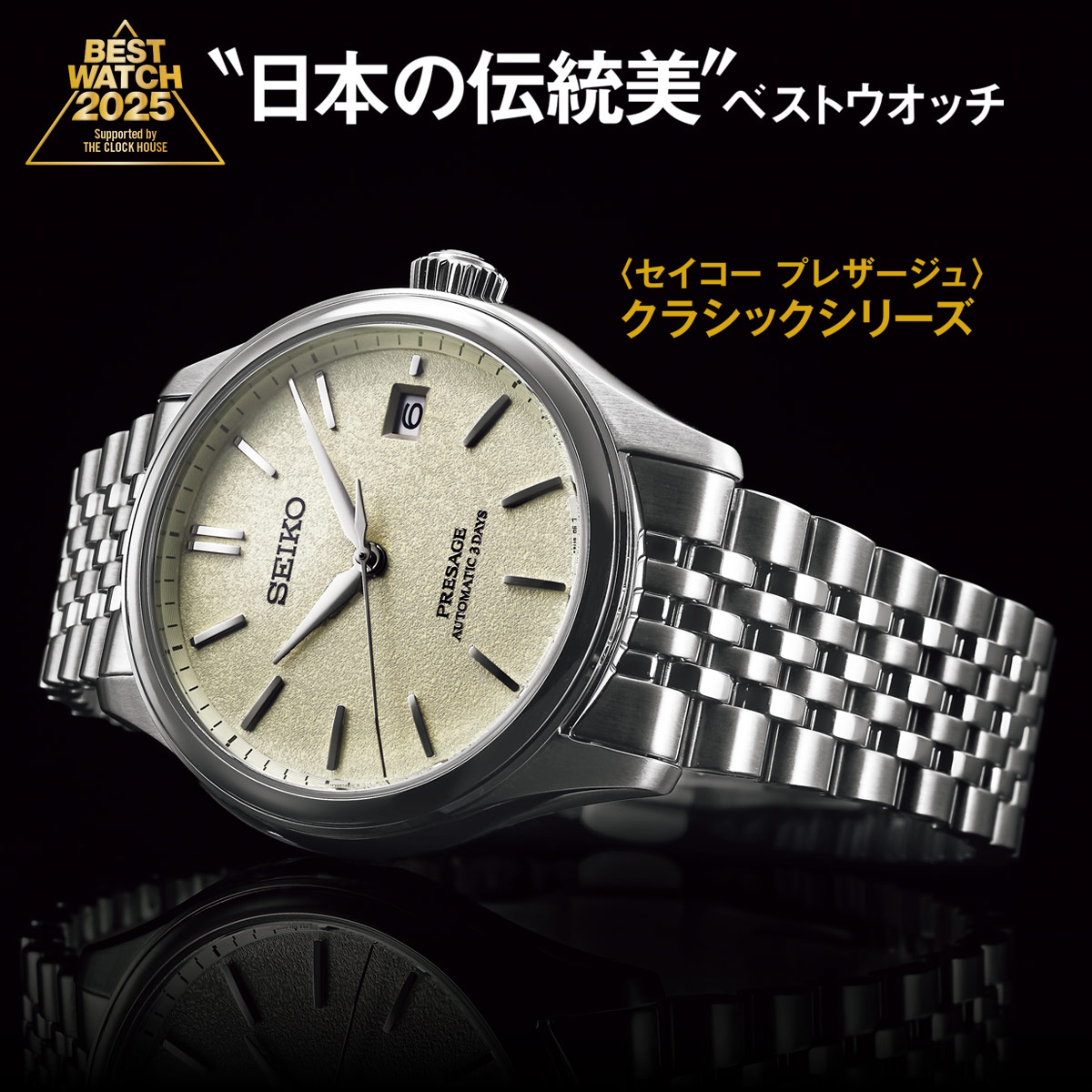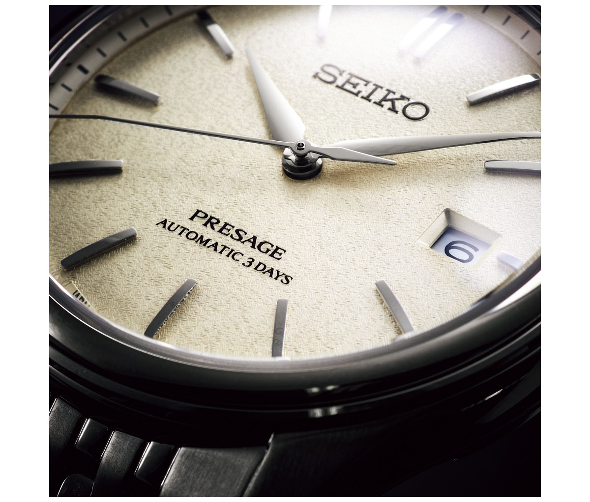 洗練されたダイヤルは、絹の柔らかな風合いを思わせる型打ち形成。和の伝統色“素色(しろいろ)”で上品かつ繊細に仕上げた現代には効率的で便利なモノがあふれる一方、手に取るほどにそのよさが際立ち、長く寄り添いたくなる道具がある。ライフスタイルになじむ実用性と、使うことでこそ引き立つ美しさ。その両方を感じさせてくれるのが、〈セイコー プレザージュ〉のクラシックシリーズだ。まず目を惹くダイヤルは、まるで絹の柔らかな質感を思わせる型打ち模様に、何色にも染まっていない純粋な繊維本来の色を表現した和の伝統色“素色(しろいろ)”で仕上げた。また新開発だという多連ブレスレットは、横から見ると丸みのあるコマが並んでおり、手首になじむような軽やかな着け心地を得られる。文字盤、ケース、ブレスレット、すべての細部まで宿るのは、日本的な“用の美”にも通じる、控えめでしなやかな美意識。手に取りやすい価格帯の1本として、ぜひ手にして味わって欲しい価値ある逸品だ。