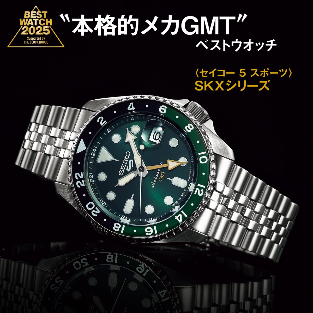 メカ好きでなくとも、機械式の繊細な動きには目を奪われる。それもこんなシースルーバック仕様ならいっそうたっぷりと堪能できるわずか4㎝程度のケースに、ただ刻むだけではない時にまつわる機能を凝縮。奇跡的とも言える技術の結晶を、身近に堪能できることこそ、機械式時計の醍醐味だ。メカ好きなら、なおさらロマンを感じずにはいられない。そのうえ技術開発はまだまだ進んでいて、複雑な機構を要する機能を搭載するモデルも、比較的手にしやすくなっている。〈セイコー 5スポーツ〉SKXシリーズはその最たる例だ。搭載する自社製機械式ムーブメント“4R34”は、ジェットセッター御用達のGMT機能を備え、さらには堅牢性も評価が高く、ブランドのレガシーモデルに倣ったダイバーズスタイルの外装ともマッチ。これで10万円を優に切るプライスとは、まさに努力の賜物といえよう。腕時計に抱くロマンを、より多くの人が手ごろに楽しめるとなれば、ベストウオッチの称号こそふさわしい。