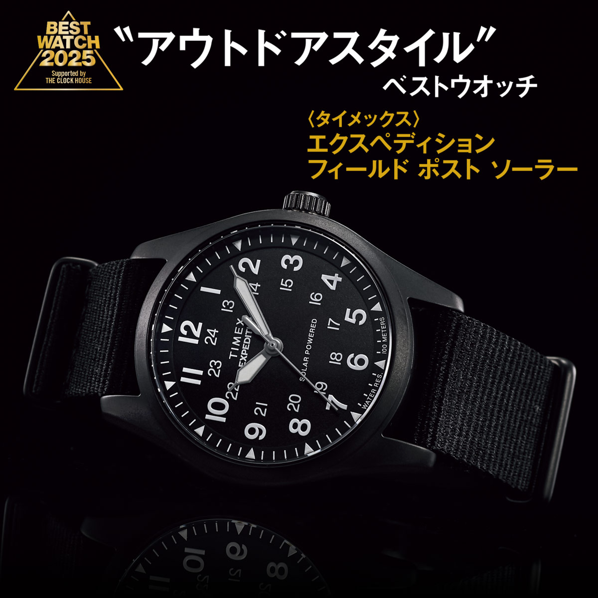 太陽光を電気に変えるソーラーを駆動方式に採用。効率よく光を受けるために工夫して、ダイヤル全体がソーラーパネルの役割を担うたっぷりと英気を養い、来たるビジネスチャンスに備える。また不測の事態が起きやすい環境ゆえ、臨機応変に対応する力が身につく。大自然で遊ぶことは、カラダの調整、スキル獲得にも繋がる。週末は登山やサーフィン。そんな成功者が多いのも納得だ。では週末の大冒険につけるべき時計は? 専門モデルをも所有するのは正直現実的ではない。頑丈で、アウトドア服や環境になじみ、普段の街での暮らしにも使いやすい。そんな条件で絞ると〈タイメックス〉エクスペディション フィールドポスト ソーラーにたどり着く。コチラは、最長4カ月稼働のソーラームーブメント、100m防水に反射防止サファイアガラス風防、針とインデックスは蓄光を塗布と、機能も十分。また36㎜の“ちいサイズ”&精悍な黒の彩りは、街なじみよくカジュアルにもマッチと、実に使い勝手がいい。
