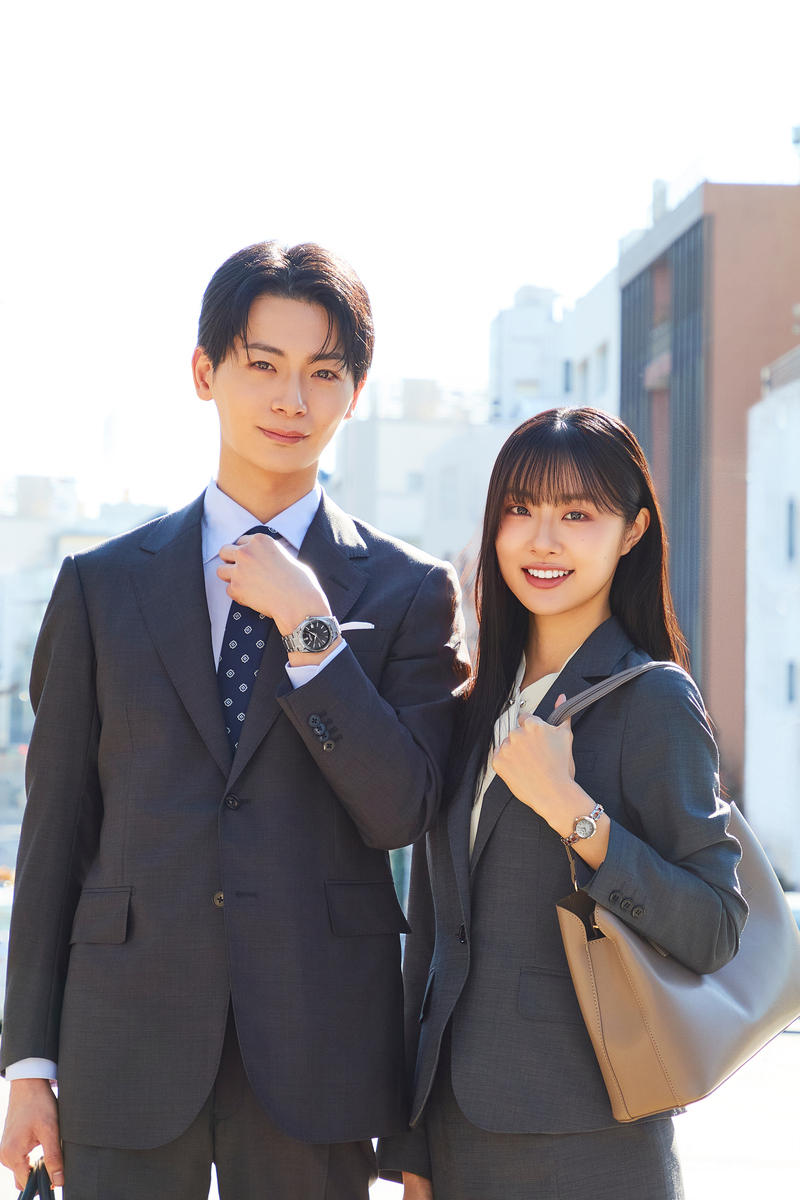 男/セイコーの腕時計[セイコーセレクション Sシリーズ SBTM341]8万5800円(セイコーウオッチお客様相談室)、ユニバーサルランゲージのジャケット3万7290円、パンツ1万7490円、スーツスクエアのシャツ5489円、(すべてスーツスクエア TOKYO GINZA店)、その他スタイリスト私物、女/セイコーの腕時計[セイコーセレクション Sシリーズ SWFH148]4万9500円(セイコーウオッチお客様相談室)、ホワイトのジャケット3万1900円、ブラウス5489円、パンツ1万9690円、トートバッグ8789円(すべてスーツスクエア TOKYO GINZA店)