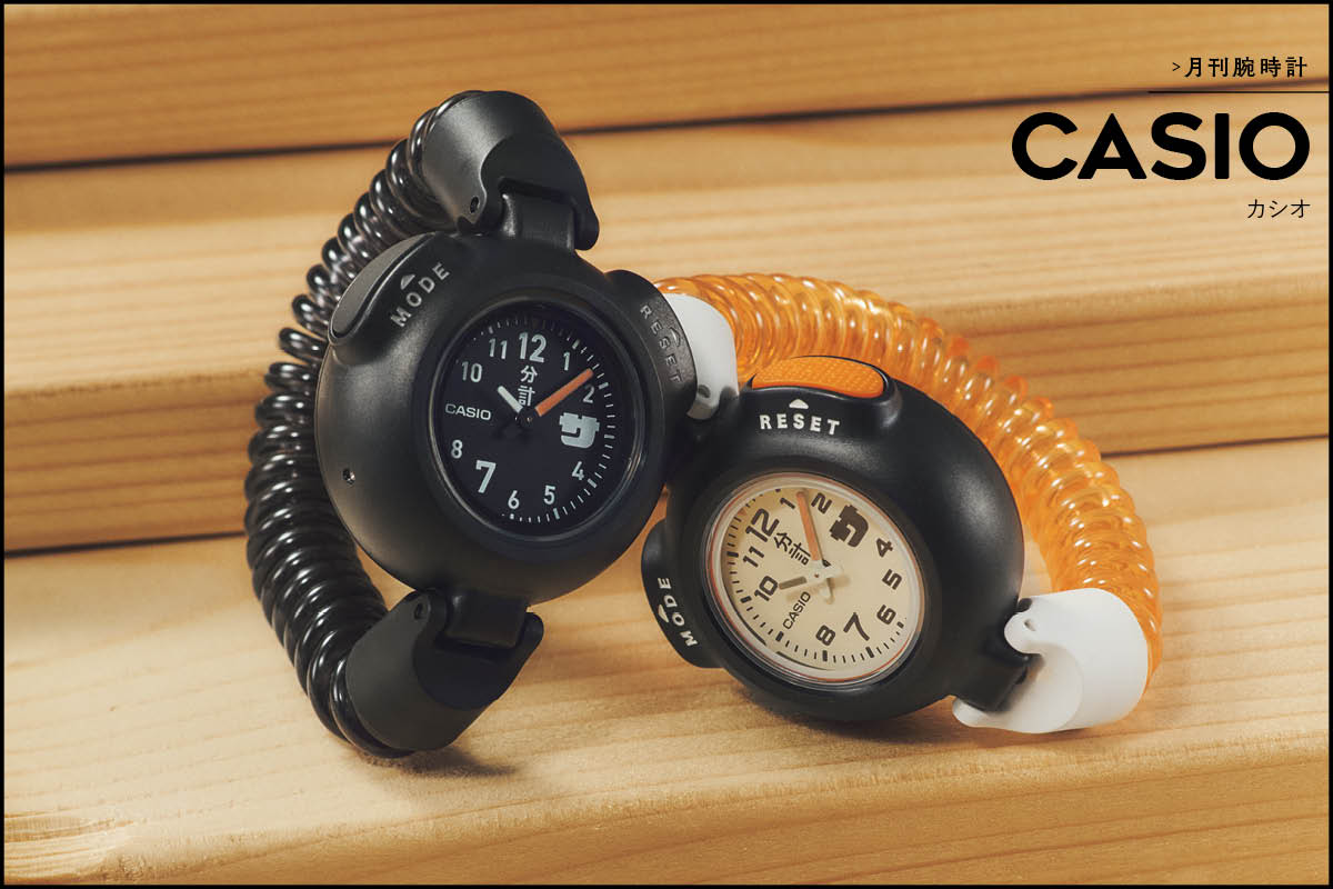 ロッカーキーから着想を得たデザインと、シンプルなボタンが快適な操作を実現。サウナモード(12分計)と通常の時刻モードをボタンひとつで切り替え可能なので、入室時間を気にせず自分のサイクルでサウナを楽しめる。文字盤は薄暗い環境でも見やすいデザインで、針には蓄光塗料を採用。内部には高温でも駆動する耐熱電池を搭載し、金属パーツを避けた樹脂外装は火傷の心配がなく安心。ケース径35.4㎜、5気圧防水、樹脂ケース、伸縮カールバンド。オレンジ[SAN-100H-7B]、ブラック[SAN-100H-1B]各1万6500円(ともにカシオ計算機 お客様相談室)